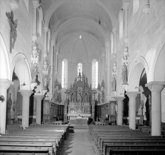 Plan allongé, fausse voûte en berceau, clocher-porche, chevet arrondi.
