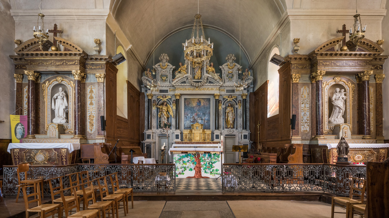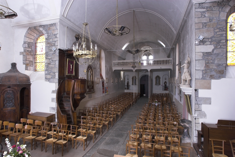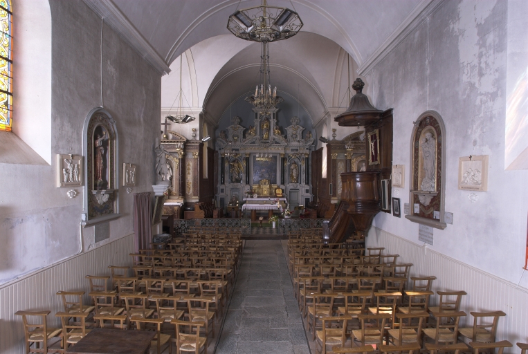 Plan en croix latine, 1 vaisseau recouvert d'une fausse voûte en berceau, clocher-porche, chevet plat.