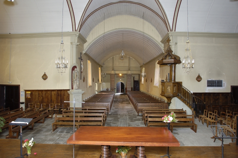 Plan en croix latine à un vaisseau, lambris de couvrement, clocher en façade, campanile, sacristie accolée au chevet, chevet à pans coupés ; toit à longs pans, noue, croupe, pignon couvert, pignon découvert, flèche polygonale. Porte remarquable.