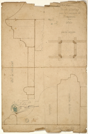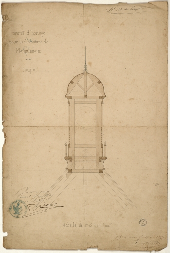Campanile de l'église paroissiale, dessin par l'architecte Mellet. (A. D. d'Ille-et-Vilaine : Pleugueneuc 2 O 227-31).