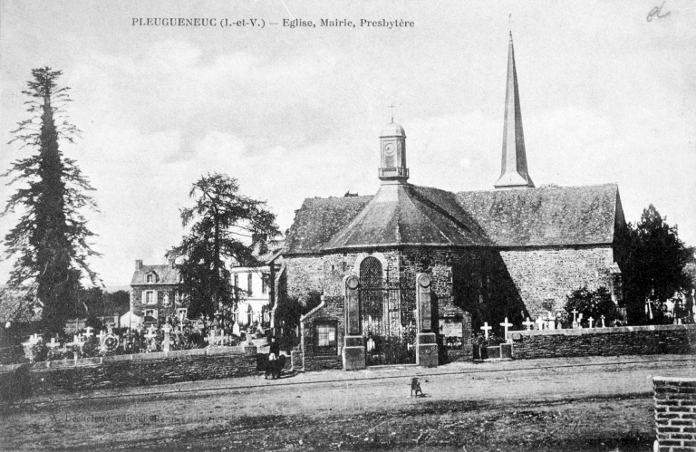 Pleugueneuc (I.-et-V.) - Eglise, Mairie, Presbytère , carte postale, A. Dechelette, Rennes (A. D. d'Ille-et-Vilaine : Pleugueneuc 6 Fi).