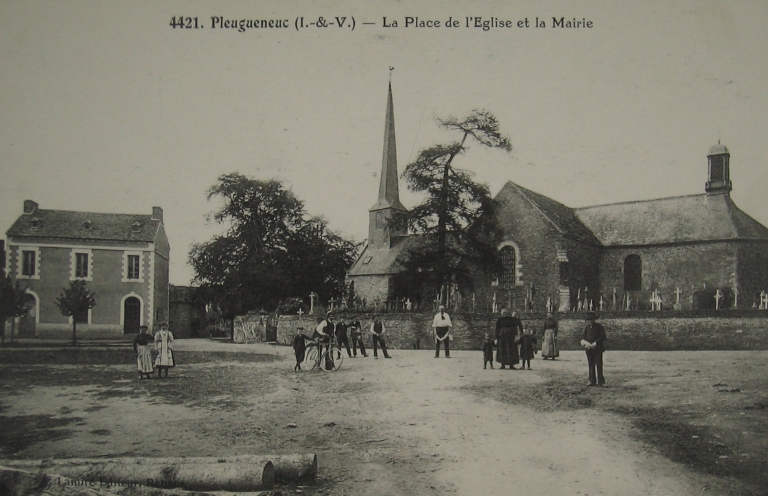 4421 - Pleugueneuc (I.-&-V.) - La Place de l'Eglise et la Mairie , carte postale, Lamiré Editeur, Rennes, [s.d.] (A. D. d'Ille-et-Vilaine : Pleugueneuc 6 Fi).