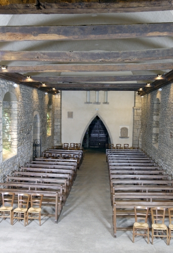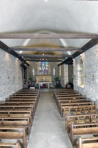 Plan allongé, lambris de couvrement, clocher-porche, ancien porche au sud avec ossuaire, chevet plat.