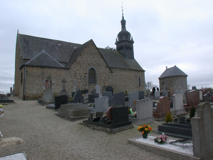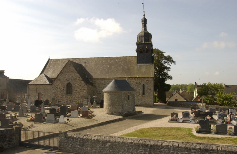 Eglise construite sur un promontoire. A conservée son enclos paroissial et son cimetière. Nef à un seul vaisseau. Plan en croix latine. Fausse voûte en berceau. Clocher en façade, clocher à bulbes. Chevet plat. Armoiries des seigneurs de Francheville portées sur la façade Ouest et plusieurs fois en façade sud. Gros oeuvre en moellons de granite. Deux assises en pierre de taille forment une bande décorative au sommet des façades.