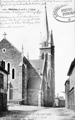 Ancienne église reconstruite aux 16e et 17e siècles, composée d'une nef à chevet plat accostée au sud, de deux chapelles irrégulières. Choeur reconstruit en 1835. Arc triomphal supprimé en 1840. Eglise actuelle construite entre 1911 et 1915, sur les plans de l'architecte Arthur Regnault avec remplois de l'ancienne porte principale dans le mur sud et d'une porte du 15e siècle dans le mur nord. Pierre avec inscription, en remploi dans le mur ouest de la sacristie (1636 MICIRE O BONAGERAN) . Pierres tombales et blasons en remploi dans le mur est.