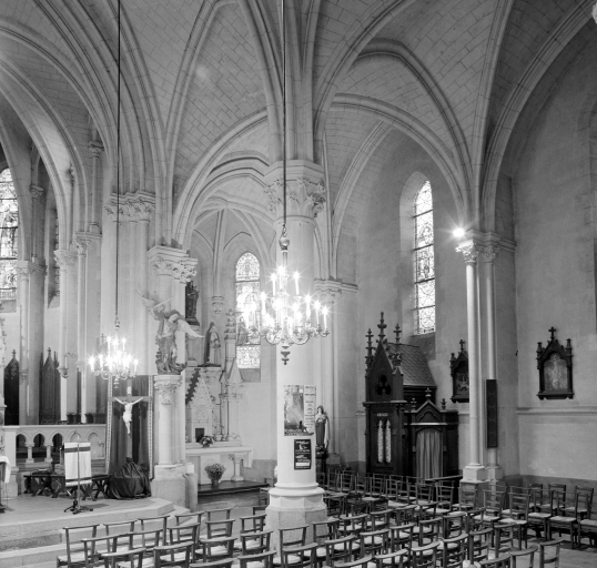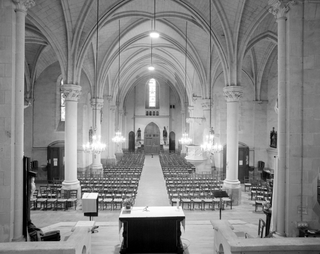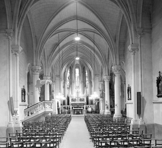 Plan en croix latine, voûte d'ogives, clocher-porche, chevet à pans coupés, style néogothique pour l'extérieur et l'intérieru. Mobilier dessiné également par l'architecte dans le même style.