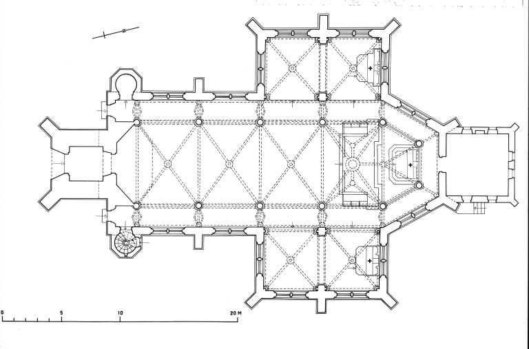 Plan en croix latine, voûte d'ogives, clocher-porche, sacristie accolée au chevet, chevet à pans coupés.