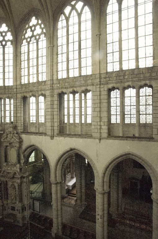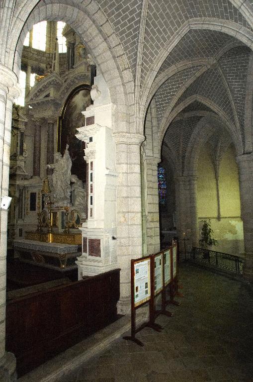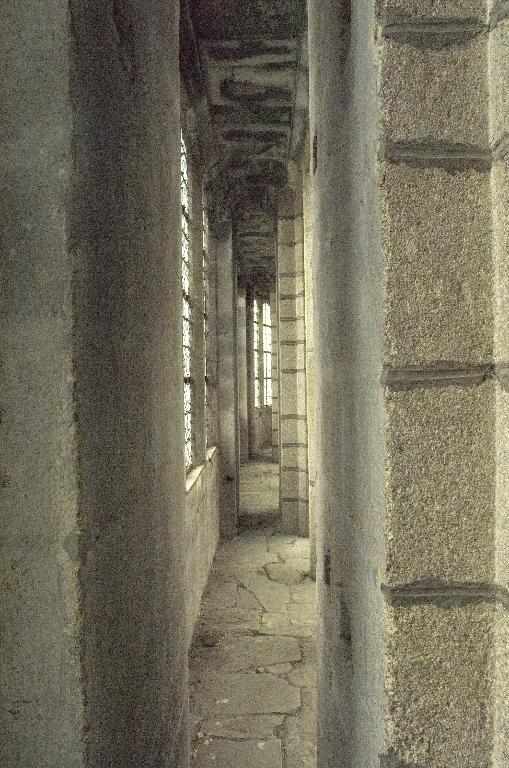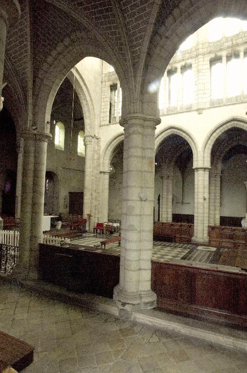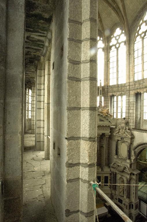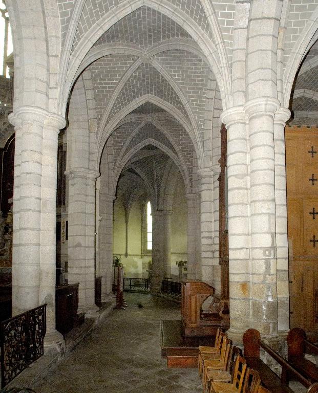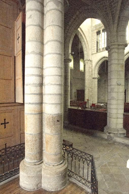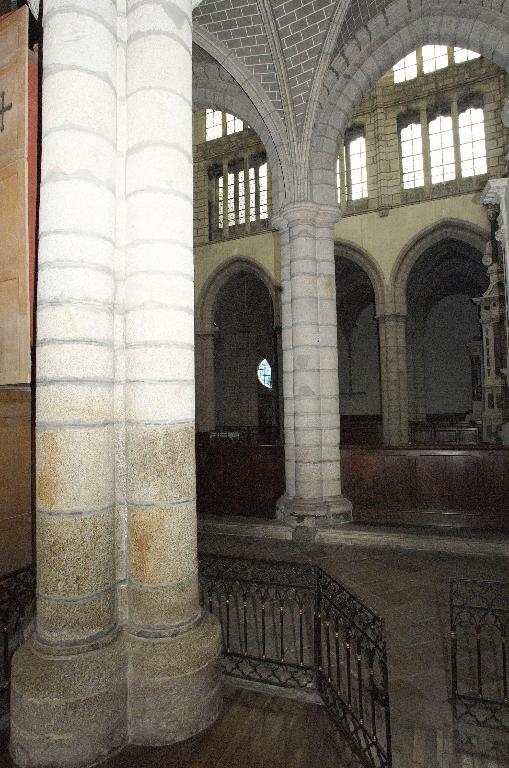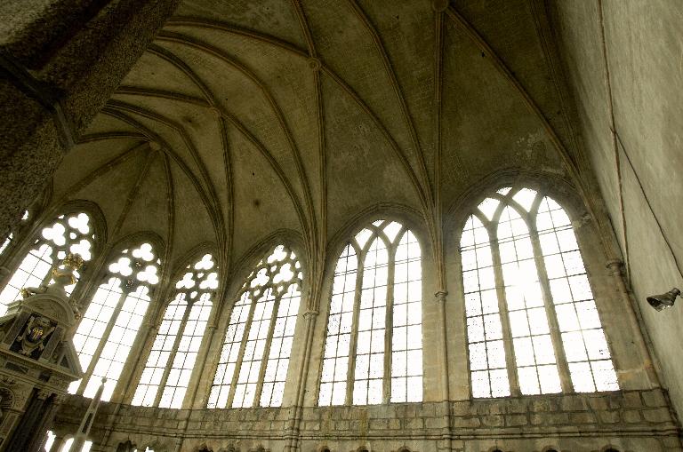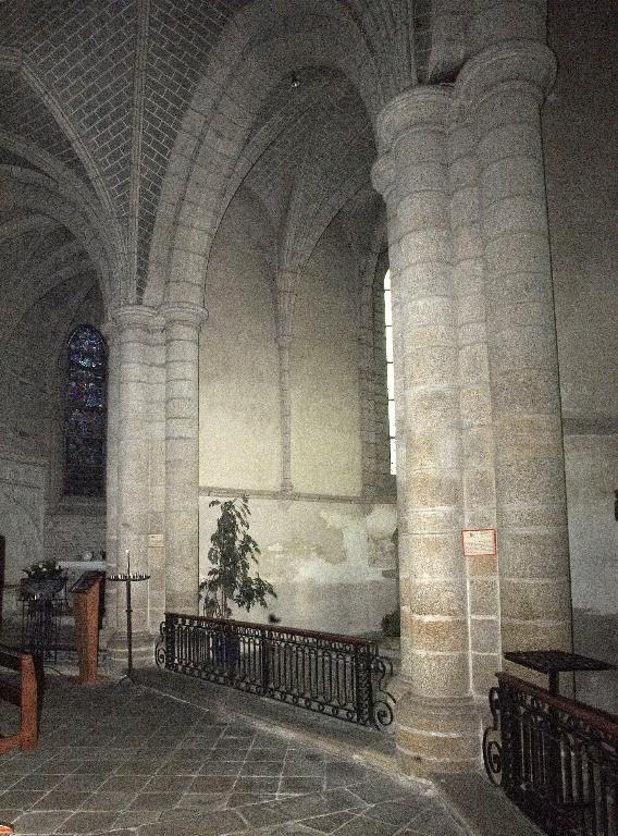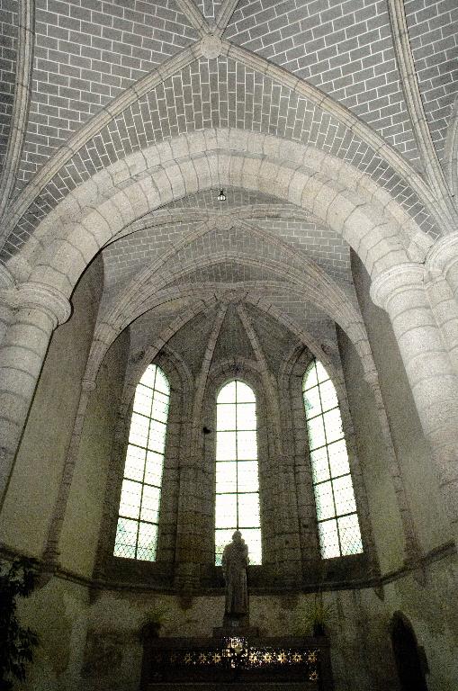 Le nouveau chœur est formé de trois travées droites et d’un rond-point à cinq pans que cerne un déambulatoire. Au niveau des travées droites, ce déambulatoire ouvre sur trois chapelles de plan rectangulaire qui communiquent entre elles et, autour du rond-point, sur une couronne de cinq chapelles rayonnantes. On ne peut sur ce point se fier au plus ancien plan connu de l’abbatiale, dressé par les Mauristes en 1650, qui omet une travée et donne de la représentation des espaces une version très schématique. En réalité, les plans récents du chœur montrent que les travées droites se rétrécissent en largeur vers l’abside, indice quasi certain selon M. Déceneux d’une reconstruction sur les fondations de l’ancien chœur roman. L’ensemble frappe par son dépouillement et son unité de style. Toutes les piles, composées de quatre colonnes posées en croix, sont coiffées de chapiteaux à corbeille lisse et tailloir dédoublé, et reçoivent des arcs à deux rouleaux chanfreinés, qu’on retrouve à l’entrée des chapelles latérales. Les piles d’entrée des chapelles rayonnantes, élargies pour masquer l’épais mur de séparation, laissent apparaître le noyau central ; néanmoins, l’ouverture de l’arc restant identique, l’architecte a dû dévier le tracé du second rouleau qui sert de formeret juste avant sa retombée sur les chapiteaux. L’unité de conception de ce chœur est particulièrement remarquable. Son parti de plan tout autant que l’élévation du vaisseau central affirment clairement son ralliement à la mode française de la seconde moitié du XIIIe siècle : au-dessus des grandes arcades, le triforium à claire-voie et les larges fenêtres hautes dépourvues d’ébrasements appartiennent à l’esthétique nouvelle des vaisseaux en « cages vitrées » du gothique rayonnant. Par-delà son apparente simplicité, cette élévation ne fait que confirmer une recherche plastique et architectonique extrêmement savante. Au-dessus des grandes arcades dont les écoinçons sont laissés nus et sans aucun décor, les deux étages supérieurs contrastent par leur aspect largement ouvert. L’important triforium à claire-voie, dont l’ouverture représente en hauteur les deux tiers des fenêtres hautes et dont l’arcature de trois travées est rigoureusement alignée sur l’ouverture de ces dernières, vient presque toucher le cordon mouluré qui court à leur base et apparente l’ensemble à un véritable clerestory. Cette formule du triforium à claire-voie, apparue sur les grands chantiers d’Ile-de-France vers le milieu du XIIIe siècle, comme la nef de la basilique de Saint-Denis, édifiée par Pierre de Montreuil à partir de 1240, les chœurs de Beauvais et d’Amiens, ou encore celui de la cathédrale du Mans, entrepris vers 1250, relève d’une conception moderne liée à un mode de couvrement savant des collatéraux, soit par des toits à deux versants, soit comme le choix en a été fait ici, par des terrasses maçonnées à faible pente. Curieusement, là où les constructeurs du domaine royal relient assez rapidement les meneaux des fenêtres hautes aux colonnes du triforium tout en y conservant des arcatures en tiers-point, le maître d’œuvre de Redon innove par une forme d’arcature alignée, remontée au maximum, mais maintient une solution de continuité entre les deux niveaux par le cordon mouluré qui les sépare et surtout ne relie pas physiquement les deux claires-voies. La retombée des voûtes sur de minces colonnettes adossées arrêtées juste en-dessous du cordon inférieur sur des culots en cône allongé relève de cette épuration générale de la modénature.