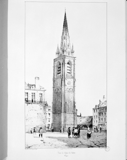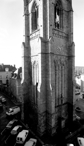 La tour nord-ouest est le seul vestige de l’ancienne façade de l’église abbatiale depuis l’incendie qui détruisit en 1780 les quatre premières travées de la nef. Son appareil de granite, semblable à celui du chœur, ses chapiteaux à corbeille lisse, de même que le réseau de trilobes et de quadrilobes qui orne les fausses arcatures appliquées sur trois de ses côtés, sont comparables au décor déjà rencontré sur le chœur. Toutefois, l’empiétement des arcs des arcatures sur le sommet de leur réseau, les chapiteaux à feuillages renflés, les frises de quadrilobes refouillés qui ornent la base et le sommet de l’étage des cloches, le tracé anguleux de la frise supérieure qui rappelle les orbevoies de ferronnerie, enfin le ressaut du cordon qui cerne la base des fenêtres de l’étage des cloches tout comme l’interruption de celui qui vient à la rencontre de leurs arcs, relèvent d'un formalisme qui appartient clairement aux premières décennies du XIVe siècle. Cette tour exceptionnelle, unique dans le paysage architectural gothique breton, fut construite en hors-œuvre par rapport à la nef de l’église qu’elle ne touchait que par son côté sud. Elle ne peut se comprendre que rattachée à un vaste et ambitieux programme de reconstruction générale de la façade occidentale de l’abbatiale incluant deux clochers symétriques, placés de part et d’autre de l’aboutissement des collatéraux de la nef romane. La tour qui s’élève d’un seul jet sans aucun retrait jusqu’à la plate-forme du clocher est cantonnée sur son angle sud-ouest par une tourelle de plan rectangulaire contenant l’escalier en vis. Ce dernier est curieusement éclairé du côté de l’ouest par des séries de meurtrières alignées que recoupent de multiples meneaux ; le couronnement de cette tourelle, une petite guérite de plan rectangulaire coiffée d’un toit en bâtière, atypique dans nos contrées, rappelle les toitures à deux versants des clochers des églises rurales du Cotentin. Sur la face sud de la tourelle, trois portes murées à différentes hauteurs devaient correspondre aux différents étages d’une importante façade écran qui aurait dû venir se plaquer contre l’extrémité de la nef romane. M. Déceneux rapproche avec justesse ces indices de la composition de la façade de la cathédrale de Saint-Pol-de-Léon, où se retrouve de bas en haut un passage devant la maîtresse vitre occidentale, puis une galerie ajourée à deux coursières superposées. Il est probable que les troubles de la guerre de Succession laissèrent en suspens ce projet grandiose qui devait apparenter la nouvelle façade de l’abbatiale de Redon à celle d’une cathédrale. À la base de la tour, du côté sud, une suite de trois arcs formerets correspond à des voûtes qui devaient se raccorder avec les collatéraux de la nef romane. Ces arcs retombent sur des culots constitués de plusieurs cônes renversés bien différents de ceux employés dans le chœur, et qui ne connaissent que peu d’équivalents dans l’art gothique breton. Apparus probablement pour la première fois dans le chœur de Guingamp vers la fin du XIIIe siècle, ces culots très particuliers, que l’on retrouve dès la fin du XIIe siècle dans plusieurs édifices anglais comme l’église Saint-Giles de Standlake dans l’Oxfordshire, employés en abondance dans le transept de Fountains Abbey au XIIIe siècle, se retrouvent dans le transept de Guingamp dans les premières années du XIVe siècle, au moment où se construisait la tour de Redon. D’autres aspects de celle-ci confirment sa filiation avec le chantier de Guingamp. On y retrouve, outre les mêmes chapiteaux à feuillages stylisés et profil cassé, un goût pour les décors plaqués ainsi qu’une certaine licence dans l’emploi du vocabulaire architectural comme le montrent par exemple la ligne de colonnettes qui, entre deux cordons moulurés, orne à mi-hauteur la face sud de la tour, et ne reçoit aucune arcature ainsi que les ressauts en élévation et en plan des cordons passant à la base des fenêtres de l’étage des cloches, qui rappellent le ressaut du triforium de Guingamp dans l’axe de la nef. Au sommet de la tour, les ailettes évidées d’un quadrilobe qui supportent les gargouilles de la plate-forme et sortent du glacis des contreforts, motif assez rarement rencontré, renvoient là encore vers Guingamp, où ce détail se retrouve, sans évidement, sur le porche du bras nord. Enfin et surtout, la flèche de Redon apparaît comme une véritable citation de celle de la tour de croisée de Guingamp. L’absence de garde-corps, les lucarnes coiffées de petits auvents en bâtière en encorbellement, les clochetons à huit pans dont les flèches reposent par l’intermédiaire de linteaux droits et unis sur des piles fasciculées de trois colonnettes à chapiteaux à corbeilles lisses, tous ces éléments qui se retrouvent dans l’une et l’autre flèche, permettent plus encore que ceux évoqués plus haut d’attribuer avec beaucoup de vraisemblance le clocher de Redon à l’atelier qui travaille à Guingamp dans les premières années du XIVe siècle.