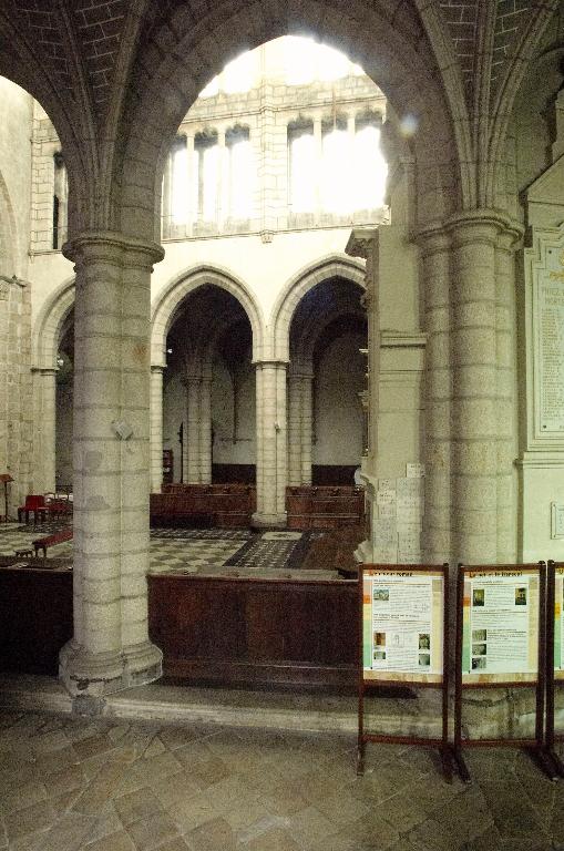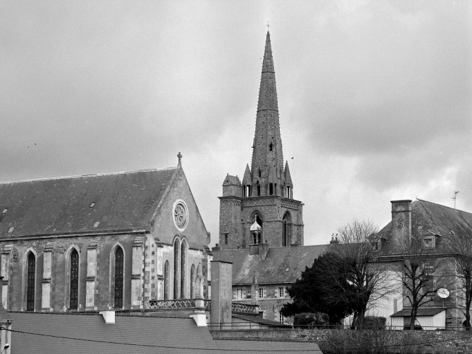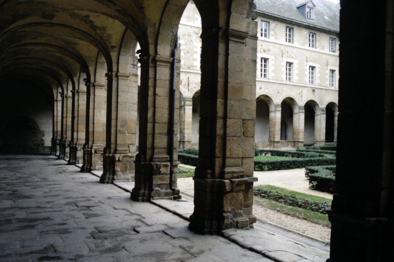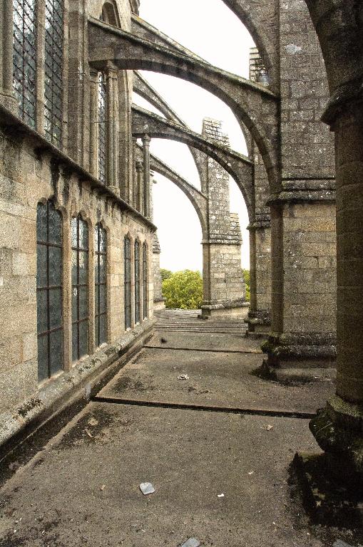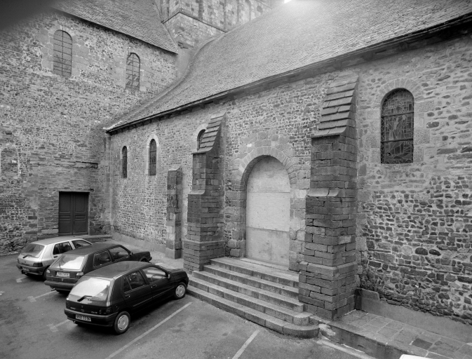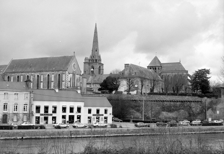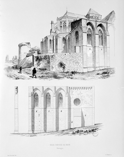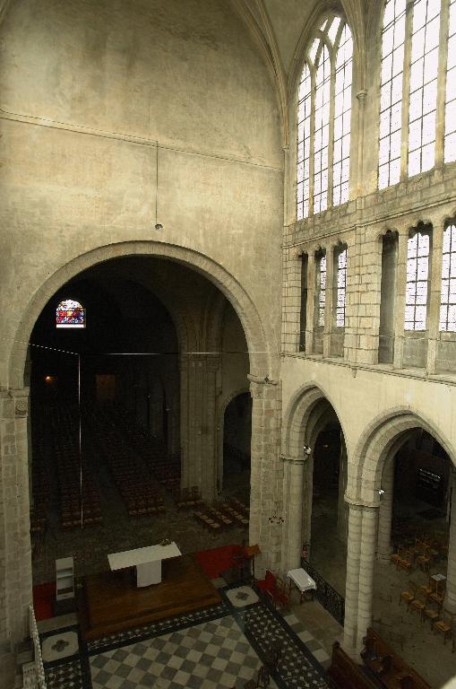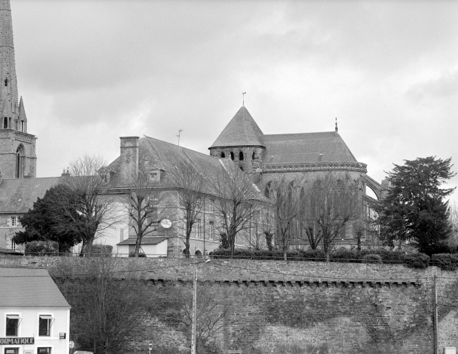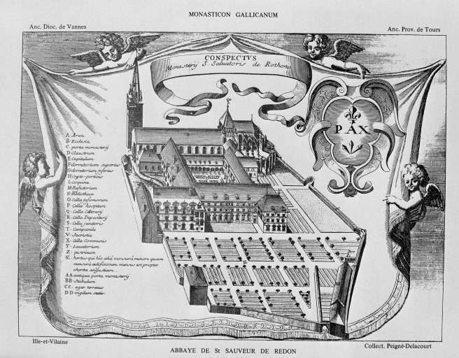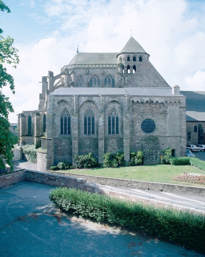 L'église reconstruite au 11e siècle, semble être alors la plus grande d'Armorique. Elle est intégrée au 14e siècle dans l'enceinte de la ville. Ce sanctuaire de l'époque romane était conçu dès cette époque avec un déambulatoire et des chapelles rayonnantes. Le bas de la nef présentait encore, avant la fin du 18e siècle, quatre forts piliers, traces d'une disposition à tour-porche dans oeuvre et chapelle-haute apparentée à celle de Saint-Melaine de Rennes, disposition modifiée lors de l'édification de l'actuel clocher au 14e siècle. Dans la première moitié du 12e siècle, la tour de croisée est construite et rend compte de l'influence de riches exemples aquitains, comme l'abbaye aux Dames à Saintes. La restauration récente du bras sud a révélé un décor peint roman exceptionnel. Le choeur commencé dans la seconde moitié du 13e siècle est imprégné quant à lui d'influences anglaises. Au nord du choeur, la chapelle ducale de Notre-Dame-de Bonne-Nouvelle, incorporée au milieu du 15e siècle dans l'enceinte urbaine rappelle l'intérêt des ducs à l'abbaye. Entre 1634 et 1636, l'architecte et sculpteur Tugdual Caris intègre dans le choeur un grand retable. Au 18e siècle, un nouveau maître autel que surmonte une statue monumentale de la foi servant de suspense eucharistique, vient compléter l'aménagement spectaculaire du choeur.