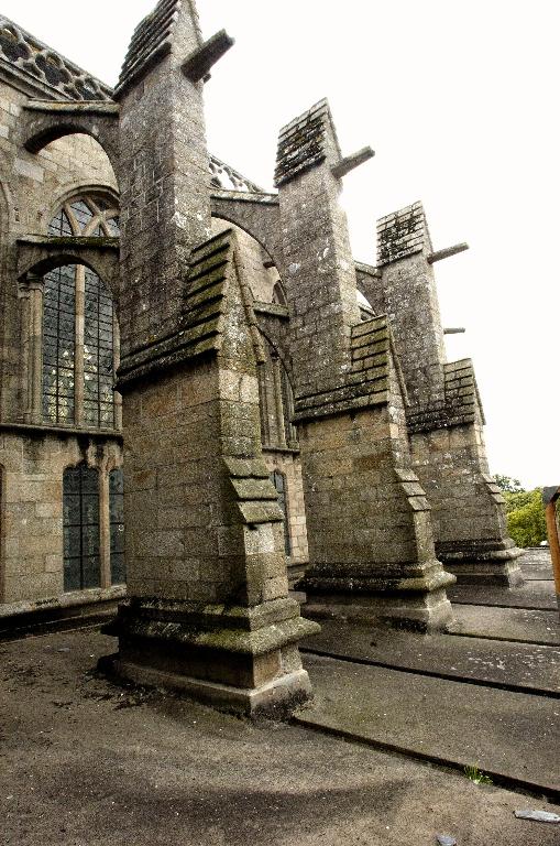 La composition pyramidale du chœur apparaît comme une réussite d’harmonie et d’équilibre. La couronne de chapelles rayonnantes tangentes les unes aux autres qui forme un socle ondulant unitaire, le triforium traité comme un bandeau continu que n’interrompt aucun redent ni ressaut, enfin les fenêtres hautes de l’abside avec leur réseau tréflé sont autant d’éléments qui rappellent, dans une version épurée, le chevet de la basilique de Saint-Denis, un des grands modèles pour les architectes de la seconde moitié du XIIIe siècle. Même s’il faut sans doute imaginer sur la couronne des chapelles un garde-corps semblable à la ligne de quadrilobes qui coiffe le vaisseau central, l’économie de la modénature et du décor sculpté, conforme à celle rencontrée à l’intérieur de l’édifice, renforce ici la clarté du discours architectural. Les culées des arcs-boutants à double volée édifiées au-dessus des piles d’entrée des chapelles rayonnantes et non, comme il est habituel, à l’aplomb du mur extérieur, de même que la saillie en angle obtus entre les chapelles de l’importante masse de mur plein qui les sépare, témoignent de la capacité de l’architecte de Redon à adapter les grands modèles. Les culées en éperon à deux ressauts, forme employée sur le côté nord du chœur de Dol, et dont le modèle vient probablement du chevet de Coutances, sont ici parfaitement adaptées à des arcs à double volée, et leur construction étagée et en retrait, palliant tout devers, témoigne d’une meilleure maîtrise dans le contrebutement. L’intrados des arcs eux-mêmes, soigneusement chanfreiné, vient descendre sous forme d’un dosseret à angles abattus au revers des culées. Au niveau des fenêtres hautes, une colonne adossée et trois colonnettes détachées sous le départ de l’arc inférieur ménagent un étroit passage pour l’entretien des vitraux. Ce principe innové sur la nef de Chartres vers 1220, repris par Pierre de Montreuil vers 1240 sur la nef de Saint-Denis, et vers le milieu du siècle au chevet de la cathédrale du Mans, de même que sur la plupart des chantiers gothiques de premier plan, montre le haut niveau de culture architecturale du maître du chœur de Redon. Dans les fenêtres hautes des travées droites enfin, les arcs supérieurs, construits avec le gros-œuvre et correspondant aux têtes des claveaux des formerets, retombent au droit des arcs-boutants, nettement en retrait de l’ouverture des fenêtres ; les arcs inférieurs sont montés avec le réseau, dans un deuxième temps, dans le prolongement des piédroits des baies, et l’espace entre les deux arcs est rempli de pierraille. Loin d’être le fruit d'une maladresse, ce détail de mise en œuvre qui éclaire le déroulement du chantier et la démarche du constructeur est totalement absent dans les travées de l’abside où l’étroitesse des trumeaux fait coïncider les deux arcs. Il est en revanche accentué dans la travée droite qui précède où l’architecte a comme on l’a vu délibérément installé une baie que son arc plus aigu et son réseau tréflé rattachent visuellement à l’abside. Alors que les travées droites du collatéral sud ont conservé leur élévation originelle, celles du collatéral nord ont été doublées vers 1440 par une chapelle venant à l’aplomb du rempart, dont l’élévation participe directement à la défense de l’enceinte. Cette chapelle dont la construction est attribuée à l’abbé Yves Le Sénéchal porte l’appellation évocatrice de « chapelle au duc » qui rappelle l’attachement constant des princes bretons pour l’abbaye et les nombreux dons faits par la dynastie de Montfort, ainsi que le projet de création d’un évêché de Redon sous le duc François Ier qui s’y fit ensevelir. Elle est éclairée à l’est par une unique baie et au nord par trois baies à trois lancettes dont le réseau à flammes et mouchettes est conforme à la date donnée par la tradition historique. Au sommet de puissants contreforts à glacis sont bandés de grands arcs mâchicoulis. Le chemin de ronde qu’ils supportent, arasé lors de la réfection tardive du toit en appentis qui couvre l’ensemble, devait rejoindre la couronne des chapelles rayonnantes en contrebas à l'est, et à l’ouest, par-delà le bras nord du transept qui a conservé sa ligne de mâchicoulis, le rempart de la ville. Au XVIe siècle, une autre chapelle de plus petite dimension, vouée à Saint-Roch, est également ajoutée contre l’extrémité du bras nord du transept.