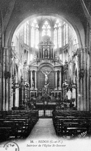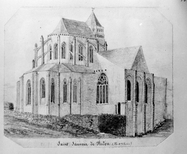 Depuis sa fondation en 832 par le moine bénédictin Conwoion, sous la protection du roi Nominoé, l’abbaye de Saint-Sauveur de Redon a toujours été directement associée à l'affirmation de la souveraineté bretonne. Le site, un promontoire schisteux, domine une vaste contrée marécageuse où confluent les rivières de la Vilaine et de l’Oust. L’église primitive, ravagée par les raids normands, est reconstruite au cours de la première moitié du XIe siècle. Le nouvel édifice dont ne subsiste aujourd'hui que la nef, dénaturée et réduite depuis un incendie survenu au XVIIIe siècle, devait comporter dès l’époque romane un important chœur à déambulatoire et chapelles rayonnantes qui en faisait alors probablement un des plus grands sanctuaires d’Armorique. La retraite du duc Alain Fergent dans l’abbaye en 1112, puis celle de sa veuve Ermengarde, fille du comte d’Anjou, témoignent de la faveur dont jouit le monastère auprès de la dynastie bretonne. Celle-ci ne se dément pas et, vers le milieu du XIIe siècle le roi d'Angleterre, Henri II Plantagenêt, qui tient la régence du duché au nom de sa belle-fille, Constance, confirme des donations faites à l’abbaye en 1112 par le duc Conan III. C’est probablement à cette époque qu’est construite l’étonnante tour de croisée qui ne sert pas de clocher et dont l’architecture imposante, inspirée par les grands modèles du monde aquitain, apparaît comme un acte hautement politique, ainsi que l’a montré M. Déceneux dans une étude récente inédite à laquelle sont empruntés la plupart des éléments historiques qui suivent. Après un incendie survenu en 1230 qui dut causer de considérables dégâts, Henri III d’Angleterre incite les moines et les évêques à assembler des fonds pour sa restauration ; en 1248, le pape accorde des indulgences aux pèlerins pour favoriser le démarrage du chantier. Un conflit survenu entre le duc Jean Ier le Roux et les moines entraîna le départ de ces derniers en Anjou, d’où ils ne revinrent qu’en 1256. Il est probable que le chantier de construction du nouveau chœur dut débuter entre 1260 et 1270, puisque la chronique mentionne en 1276 le don d’un crucifix et de deux statues en argent de la Vierge et de saint Jean, ornements de très grand prix traditionnellement associés au maître-autel. Cette mention ne signifie pas que le nouveau chœur était achevé mais qu’il était du moins largement entamé ; les parties basses du vaisseau central et la couronne des chapelles, alors peut-être réalisées, pouvaient probablement accueillir le culte. La présence dans les verrières hautes de portraits des ducs Jean Ier et Jean II, signalée par le marquis de Molac en 1633, indique enfin que vers 1300, le gros œuvre était certainement achevé. C’est donc dans les vingt dernières années du XIIIe siècle qu’il convient de situer la reconstruction du chœur gothique de Redon. Après l’achèvement de celui-ci, on entreprend, probablement autour de 1310, la construction à l’ouest, devant l’ancienne nef romane, d’une importante façade. De l’ambitieux projet conçu, seule fut réalisée la tour nord, dont l’achèvement doit se situer avant 1341, date à laquelle débute la guerre de Succession. À partir de 1350, l’abbé Jean de Tréal fait reconstruire l’enceinte urbaine qui incorpore l’abbaye. La victoire et l’accession au trône ducal de Jean IV de Montfort, qui réside à plusieurs reprises dans l’abbaye où se trouvait un logis princier, se traduisent par l’ajout, vers 1440, d’une chapelle placée sous le vocable de Notre-Dame-de-Bonne-Nouvelle, encore appelée « chapelle au duc », contre les trois travées droites du collatéral nord du chœur. Cette chapelle fortifiée est intégrée à l’enceinte de la ville, réparée et augmentée à la même époque. En 1449, à la demande du duc François Ier, le pape Nicolas V érige l’abbaye en évêché à partir de quatorze paroisses soustraites aux évêchés de Vannes, de Rennes et de Saint-Malo, qui obtiennent six mois plus tard l’annulation de cet acte. Les bâtiments monastiques sont entièrement reconstruits entre 1640 et 1650 par les bénédictins réformés de Saint-Maur, qui font également installer dans le chœur un imposant retable, dû à l’atelier lavallois de Tugal Caris. En 1780, suite à un incendie qui ravage la nef, cette dernière, réduite de quatre travées et rabaissée, voit ses fenêtres hautes supprimées et se trouve transformée en nef obscure. L’ensemble est couvert par un toit unique et une nouvelle façade occidentale de style classique est construite, en retrait de la tour nord-ouest désormais isolée à la manière d'un campanile. À cette époque ou au début du XVIIIe siècle, le triforium est rendu aveugle au niveau de l’abside par une toiture en appentis ajoutée sur le déambulatoire et les chapelles rayonnantes, tandis qu’il reste à claire-voie dans les travées droites, protégé des eaux du toit du vaisseau central par des auvents installés entre les arcs-boutants. Ces modifications qui nuisaient à l’esthétique du chœur ont été enlevées en 1910 lors de sa restauration par Paul Gout qui lui a rendu son aspect initial.