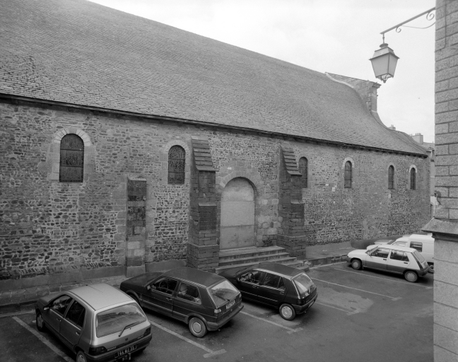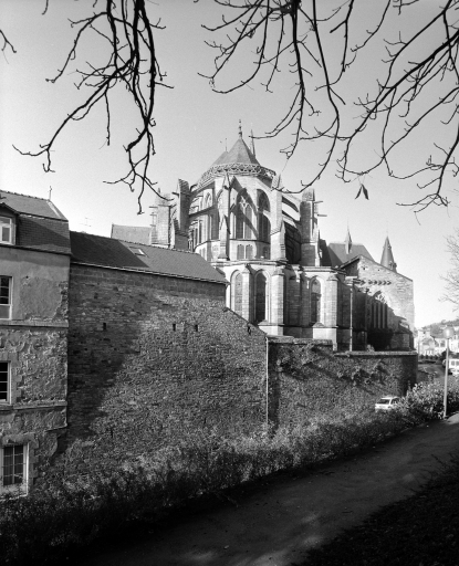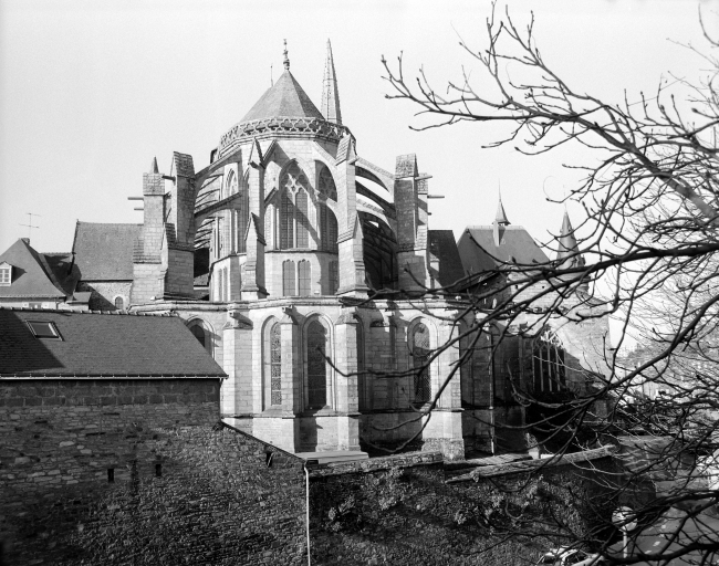 La vue du chœur depuis le nord montre que ce dernier a été construit tangent à l’enceinte urbaine, exactement à l’endroit où le rempart, parallèle à l’abbatiale, faisait un coude pour s’infléchir vers le sud et rejoindre la Vilaine. Cette position défensive importante, au point le plus haut de la ville, dominant la rivière et les marais, est représentée sur un manuscrit de 1543 dessiné en vue d’un projet d’aménagement et de canalisation de la Vilaine. La configuration particulière du site, une position défensive exposée à l’angle nord-est de l’enceinte de la ville, a sans doute entraîné le choix rare en Bretagne, hormis l’exemple du chœur de Saint-Mathieu-de-Fineterre, d’un extrados en couverture formant terrasse pour couvrir la couronne des chapelles, évitant d’offrir aux incendies des toitures en charpente.
