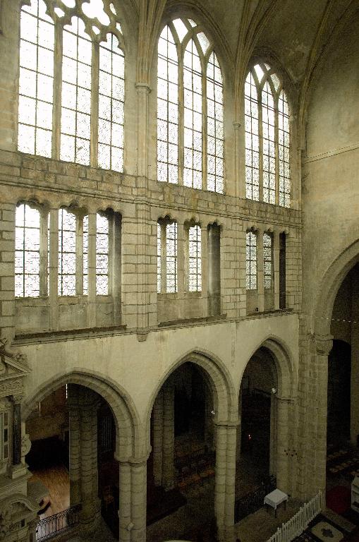 La différence dans le réseau des fenêtres hautes, lancettes recroisées d'inspiration normande pour les deux première travées droites, et lancettes en arc trilobés surmontées de trois trilobes tangents pour les baies suivantes, confirme ce parti pris de hiérarchisation entre la première partie du sanctuaire et l’abside qui intègre esthétiquement la dernière travée droite du chœur. M. Déceneux fait observer qu’une semblable hiérarchie dans l’emploi des baies se retrouve dans le chœur de la cathédrale du Mans, dont les chapelles rayonnantes sont éclairées par de simples lancettes, le triforium par des baies à lancettes recroisées et l’étage supérieur par des fenêtres à remplage tréflé ; on verra plus loin que ce n’est pas le seul point de comparaison possible entre les deux édifices. Ce jeu subtil entre les pleins et les vides, entre association et dissociation, unification et différenciation, ornement et dépouillement, témoigne de la science consommée du maître du chœur de Redon à manipuler les figures de style et la syntaxe de son art.