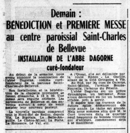 A l'instar des six autres églises du diocèse de Rennes construites sur le même modèle, l'église Saint-Charles de Redon est construite dans un quartier neuf et populaire, le quartier Bellevue. Après l'aménagement d'une chapelle provisoire dès 1965, la nouvelle église est bâtie en 1971 par l'entrepreneur Ducassou avec des panneaux de béton préfabriqué fournis par l'entreprise C.I.A.B. de l'Hermitage, sur des plans des architectes Yves Perrin et Georges Martin (date et attributions par travaux historiques). Les motifs moulés sur le béton sont issus d'un modèle créé par le sculpteur Francis Pèllerin. Elle est inaugurée en 1972. L'aménagement du choeur est confié à Jean-Pierre Lucas, artiste local.