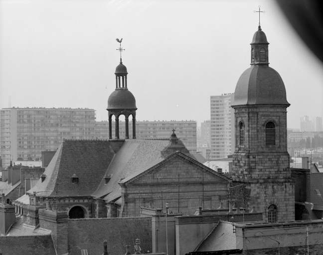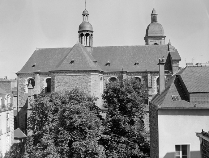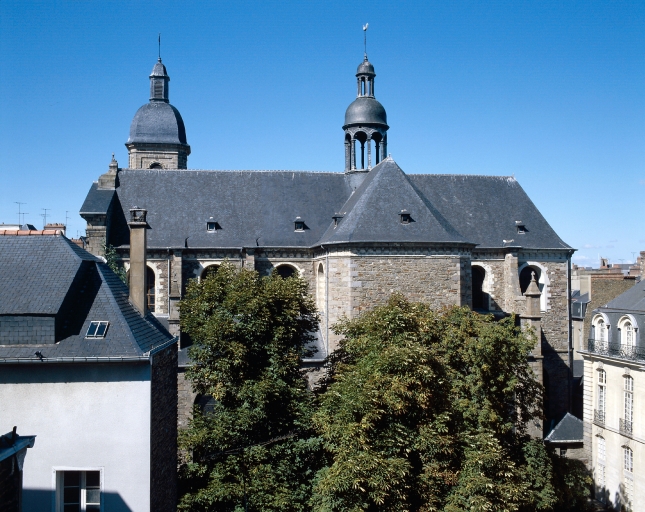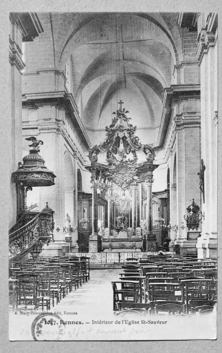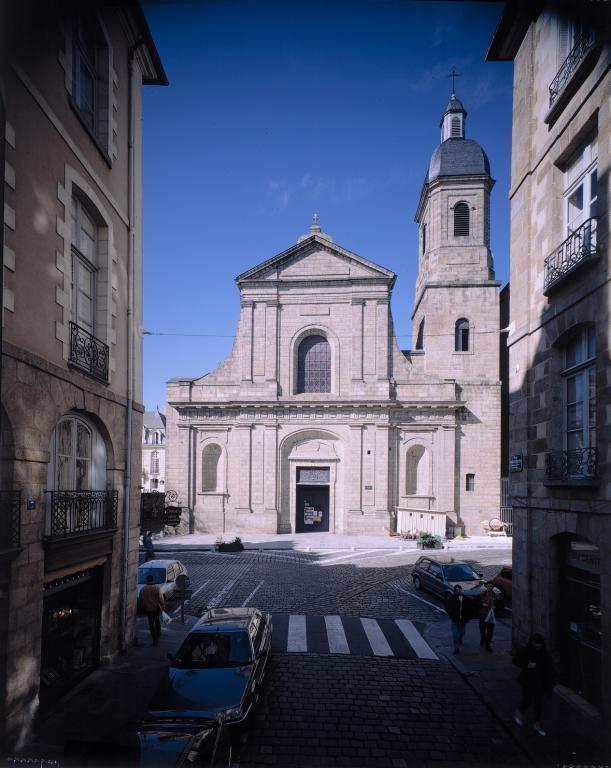 L'église paroissiale actuelle a été édifiée à l'emplacement d'une ancienne église tréviale, dépendant de la paroisse de Toussaint et dédiée à saint Sauveur. Cet ancien édifice, dont les parties les plus anciennes remontaient aux 12e et 13e siècles, avait été maintes fois transformé. Les bas-côtés avaient été élevés en 1445 et 1446 et le chevet en 1481 (datés par travaux historiques) . Erigée au rang d'église paroissiale en 1667. Elle s'est effondrée en 1682. La construction de la nouvelle église va s'échelonner tout au long du 18e siècle, selon une orientation inverse à la précédente, par l'architecte François Huguet. La première campagne de travaux de 1703 à 1718 a débutée par le choeur et la croisée du transept. A la suite de l'incendie de Rennes en 1720, ces parties seront restaurées entre 1721 et 1724. François Huguet décède vers 1730, les travaux sont repris par les architectes Chocat de Grandmaison et Forestier. En 1741, s'élève la tour du clocher d'après les plans de Forestier. Les travaux se termineront en 1764 par le portail principal, oeuvre des sculpteurs Jean Boucher et Jean Le Coq. L'église a été érigée en basilique le 6 août 1916.