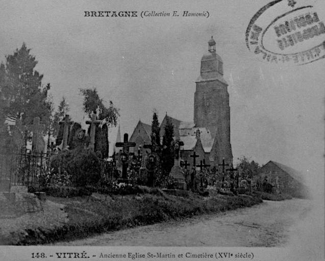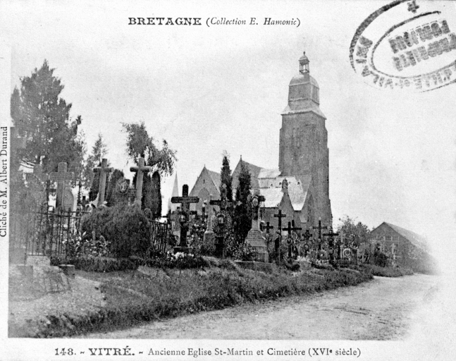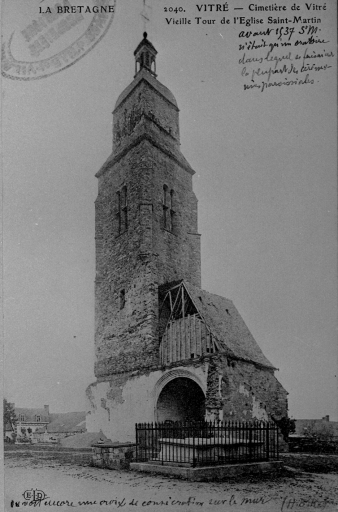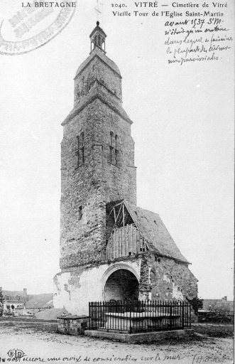 Chapelle Saint-Martin donnée en 1112 à l'abbaye Saint-Melaine de Rennes. Succursale de l'église priorale Notre-Dame, elle est devenue paroissiale en 1803. La nef avait été reconstruite en 1822 (daté par travaux historiques) . Désaffectée et démolie en 1897 (daté par source) il n'en subsiste actuellement que la tour du clocher du 15e siècle. L'ancienne flèche de 1427 est remplacée par une toiture à l'impériale avec campanile en 1660.