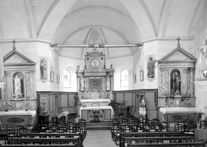 Chapelle frairienne mentionnée au 17e siècle, reconstruite au 1er quart du 18e siècle, porte la date 1712 sur la fenêtre du transept sud. Massif occidental refait au 20e siècle ainsi que les baies de la nef. Elle est érigée en église paroissiale en 1820. Croix monumentale du 16e siècle ?