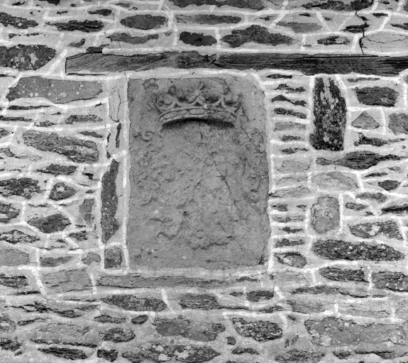 Armes martelées non identifiées, support : mur extérieur du chevet ; sujet : engoulants, support : poutre de gloire.
