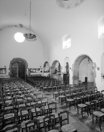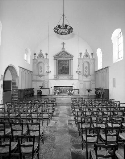 Plan allongé, voûte en berceau plein-cintre, fausse voûte d'ogives, chapelle latérale avec niche à jour céleste, chevet plat.