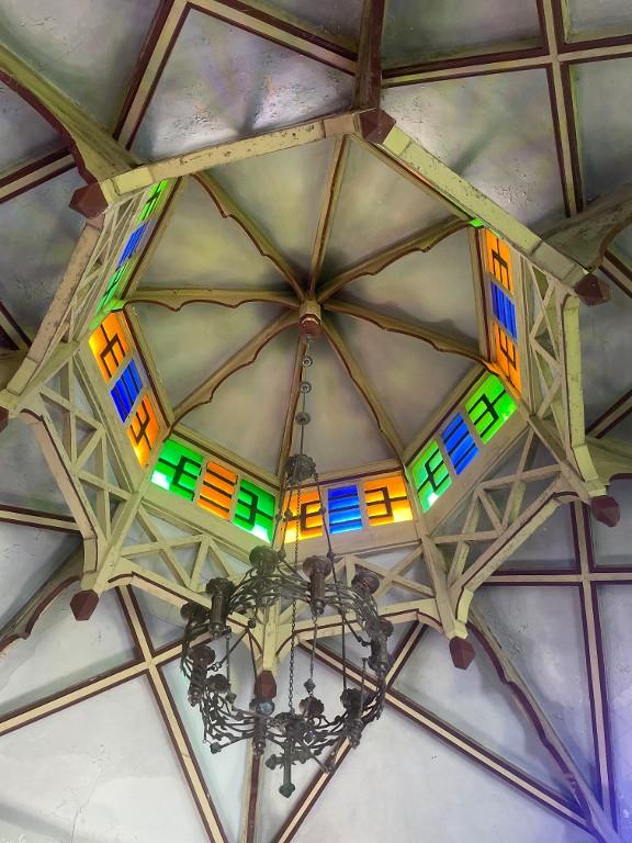 Plan centré, coupole, chevet avec niche à jour céleste, style chinois. Étages : 1 vaisseau Couvrement : coupole Décor : peinture ; menuiserie représentation : palmette, grecque, fleur ; ornement végétal Sujet : ornement végétal, support : lambrequin Couverture (type) : toit conique ; appentis ; lanterneau Escaliers : escalier de distribution extérieur ; escalier droit Typologie : style chinois ; chevet avec niche à jour céleste.