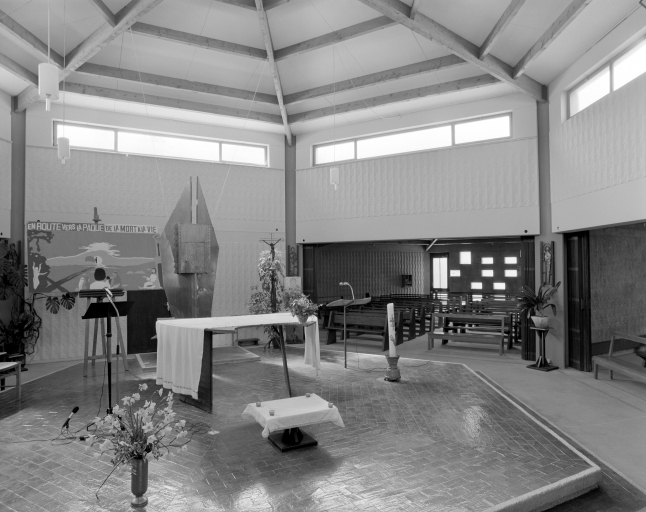 Chapelle Saint-Julien Maunoir construite dans la 2e moitié du 20e siècle par le cabinet d'architecte Yves Perrin et Georges Martin, aménagement du choeur par Paul Griot (attributions par travaux historiques) .