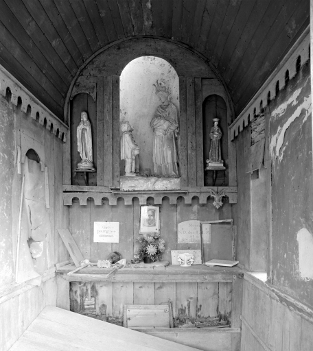 Plan masse, lambris de couvrement, choeur avec niche à jour céleste. Toiture avec épis de faîtage en zinc.