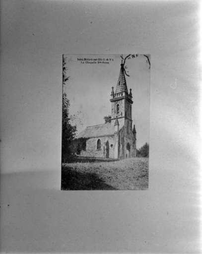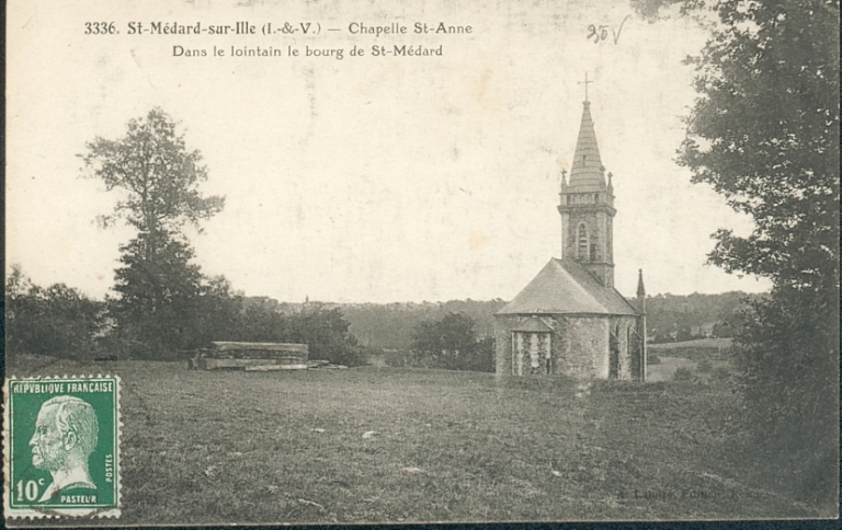 Saint-Médard-sur-Ille (I.-et-V.). Chapelle Sainte-Anne. Dans le lointain le bourg de Saint Médard. Carte postale [s.d.] (Collection particulière M. et P. Fontaine).