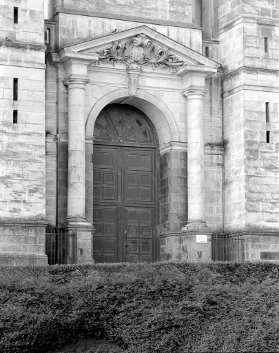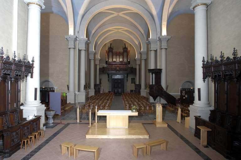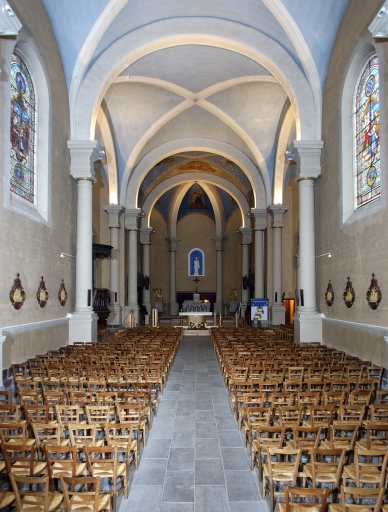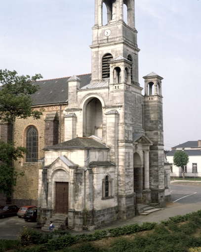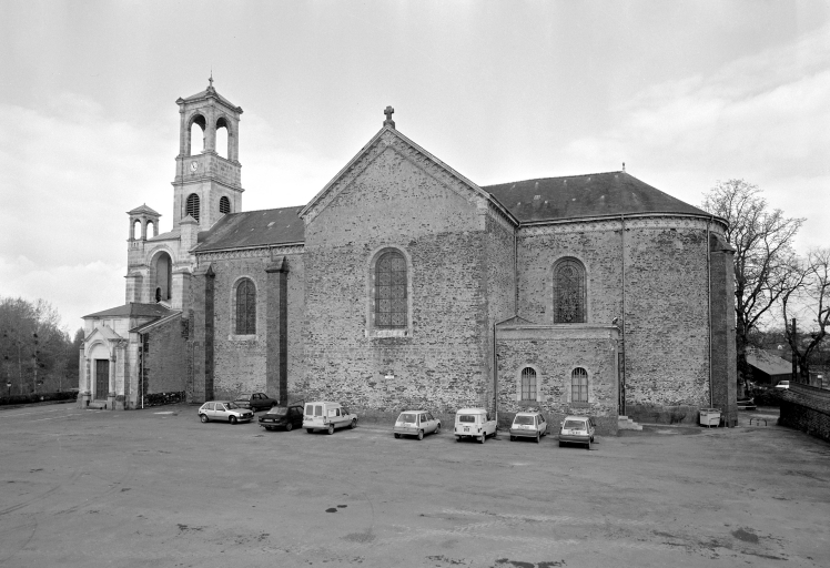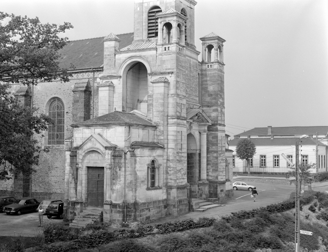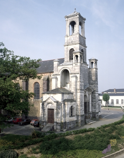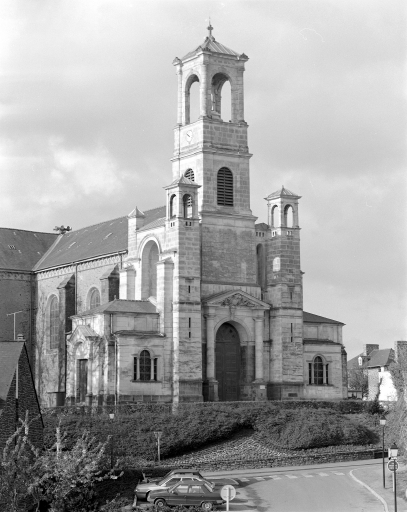 Eglise implantée sur une ancienne motte féodale. Deux campagnes de construction sont perceptibles par les matériaux employés. Gros oeuvre de la nef et du transept en moellons de schiste avec une corniche en brique, tour du clocher élevée en pierre de taille de calcaire. La façade présente une élévation néoclassique qui rappelle le style employé par le tribunal construit sur la place voisine. La construction étagée du clocher ainsi que l´usage de serliennes font référence à l´Italie. Plan en croix latine, nef à un seul vaisseau terminé par un chevet arrondi. Voûtes d'ogives. Décor peint intérieur en partie disparu.