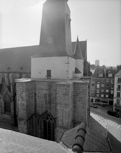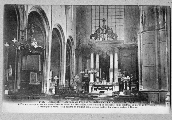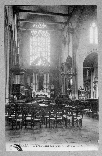 L'origine de l'église Saint-Germain remonte au 12e siècle, elle appartenait au chapitre cathédral de Rennes. L'édifice actuel conserve dans le bras sud une arcade avec deux chapiteaux du 13e siècle, mais la majeure partie de son gros-oeuvre date des 15e, 16e et 17e siècles. La préoccupation d'agrandir l'église est signalée dès 1434, date à laquelle le duc Jean V donne son accord pour agrandir l'édifice sur la rue de Corbin. Les travaux ont débuté par le bas-côté nord daté de la 2e moitié du 15e siècle. La façade ouest et la tour du clocher, laissée inachevée, ont été construites au 16e siècle, la date de 1585 est portée sur le contrefort nord-ouest de la tour du clocher. A cette époque le projet de voûtes d'ogives au-dessus de la nef est abandonné au profit d'un couvrement plus haut en berceau brisé, réduisant à un rôle décoratif le départ des ogives toujours visibles. Le bras sud a été construit de 1606 à 1623 par Germain Gautier et les chapelles latérales ont été ajoutées tout au long du 17e siècle. La chapelle, sud-est, du Saint Esprit est terminée en 1699 (daté par source) . Des restaurations ont été effectuées au 19e siècle par Charles Langlois et au 20e siècle par Raymond Cornon.