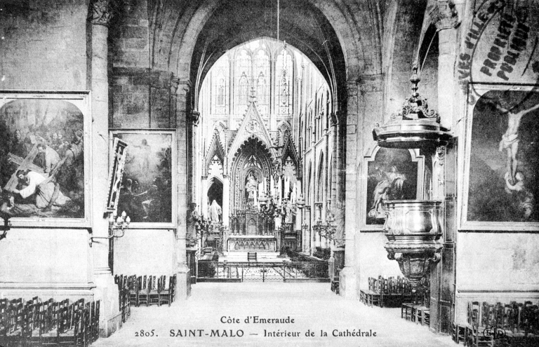La cathédrale a été construite à l'emplacement d'une ancienne église du 7e siècle, relevée au 9e siècle et dédiée à Saint-Vincent-de-Saragosse. C'est sous l'épiscopat de Jean de Chatillon, appelée aussi Jean de la Grille (1146-1163) qu'une nouvelle église cathédrale fut édifiée et dédiée à Saint-Malo. De cette période subsistent : une partie du cloître, la nef, la croisée du transept et une travée de chacun des bras nord et sud. Le chœur, légèrement désaxé, a été reconstruit vers le milieu du 13e siècle dans le style gothique normand. La tour du clocher commencée au 12e siècle a été surélevée en 1422. Du 15e siècle date aussi le collatéral sud, comme le confirment l'enfeu ou fut inhumé Olivier Troussier en 1475, et les armes sculptées de l'évêque Jean Lespervier (1450-1485).