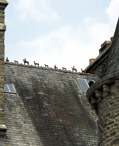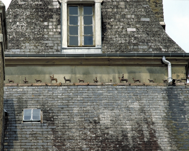Présence d'une chasse à courre en terre cuite ornant le faîtage du toit réalisée dans les ateliers du village voisin de La Poterie.