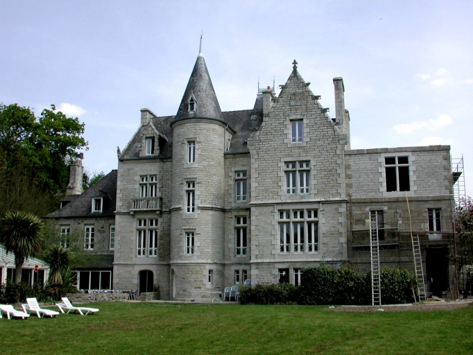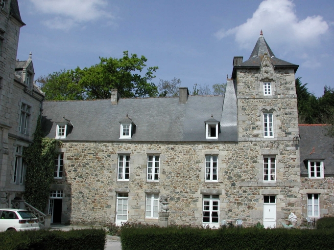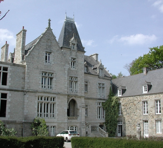 Plan d'ensemble en L. Le corps de logis principal, à double orientation sur cour et sur jardin, est édifié sur un plan à deux corps en équerre avec tour et porte d'entrée dans l'angle. Construit en granite (moellons équarris pour le gros-oeuvre et pierre de taille pour le chaînage d'angle et les encadrements des baies), il comprend un étage de soubassement, un rez-de-chaussée surélevé, un étage carré et un étage de comble. Un escalier dans-oeuvre, tournant à retours avec jour, en charpente, dont le repos occupe l'espace de la tour circulaire postérieure, assure la distribution intérieure. Le décor, d'inspiration gothique manifeste, est constitué de croisées, de rampants à crochets, de fleurons, de blasons, d'une balustrade ajourée de quatrefeuilles, d'arcs brisés et d'accolades aux linteaux. Ce corps de logis est flanqué d'une aile en retour d'équerre de plan rectangulaire allongé, simple en profondeur, très remaniée et restaurée, construite en moellons de schiste, grès, poudingue et granite. Cette aile est cantonnée à son extrémité d'une tour d'escalier de section carrée à quatre niveaux, ajourée, au deuxième étage, d'une fenêtre à double accolade et moulurations, au troisième étage, d'une ancienne lucarne dont le pignon est intégré au gros-oeuvre et dont la partie supérieure déborde le toit (remploi). La distribution intérieure est assurée par deux escaliers tournants à retours avec jour en charpente situés à chaque extrémité.