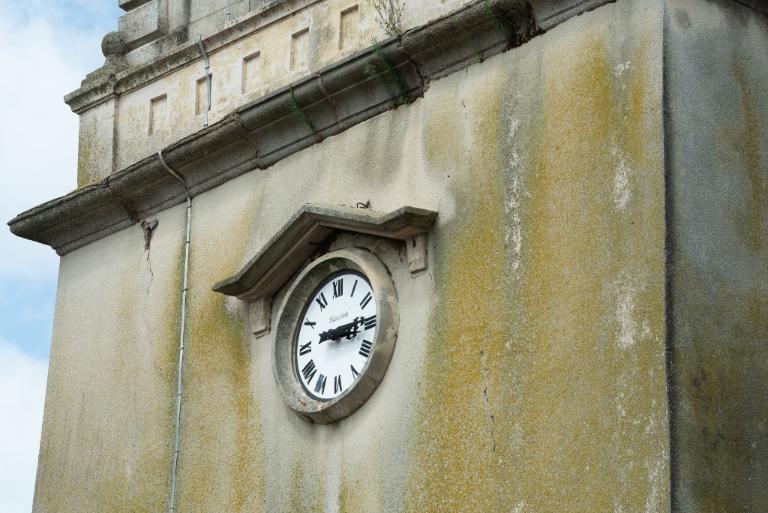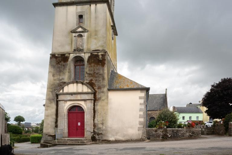 En 1724, l’église est dotée d’une tour de clocher surmontée d’une flèche en ardoises avec deux dômes à sa base (proche de ce que l’on retrouve aujourd’hui à Grace-Uzel). De cet ancien clocher, ne subsiste que la base qui a été enduit à la chaux, la flèche ayant été détruite en 1866 pour en construire une nouvelle, en calcaire de Richemont (Charente). Le 28 janvier 1748, les délibérants du général de la paroisse et plusieurs des plus notables personnes de la paroisse décident d’installer une horloge sur le clocher. Des réparations sont effectuées sur l’horloge en 1781, à la demande du recteur Louis Cherdel. Les trésoriers François Ody et Jean Baptiste Le Roux, marchands de toiles, sont chargés de convenir des conditions du marché avec l’horloger, sieur Thebeau.