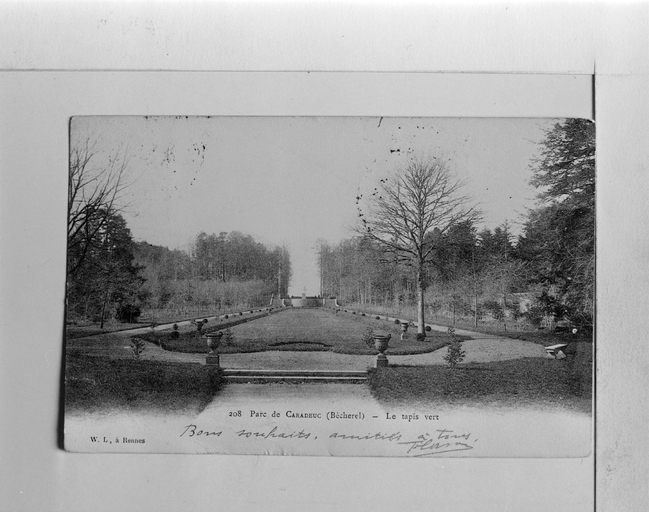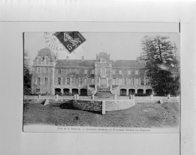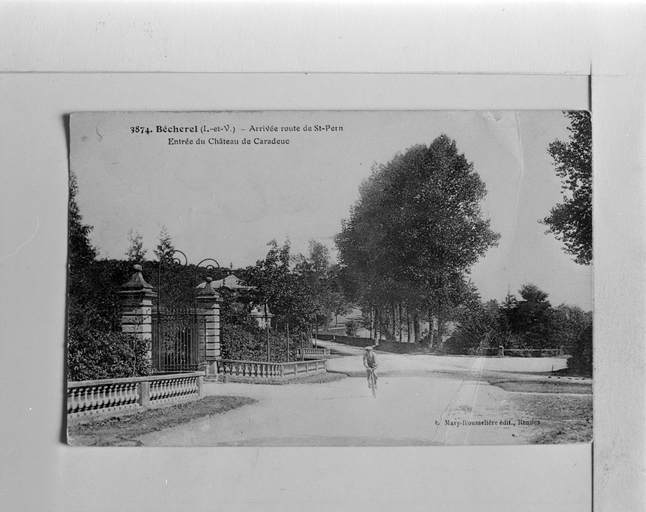 Le château de Caradeuc en Plouasné fut la propriété du procureur général de la Chalotais qui possédait également le château du Plessis à Vern-sur-Seiche de la même époque. Il fut construit pour Anne-Nicolas de Caradeuc, conseiller et doyen du Parlement de Bretagne, en 1723. Le parc du château est en Bécherel tandis que le château est en Plouasné. Le château fut modifié au début du 19e siècle (élévation sud reconstruite) puis de 1890 à 1900 (époque des frontons du pavillon central, et de la transformation du parc par Edouard André). Le parc fut redessiné à l'anglaise vers 1850 et aménagé à partir de 1898 avec de nombreux remplois provenant de régions diverses. Site classé en 1945.