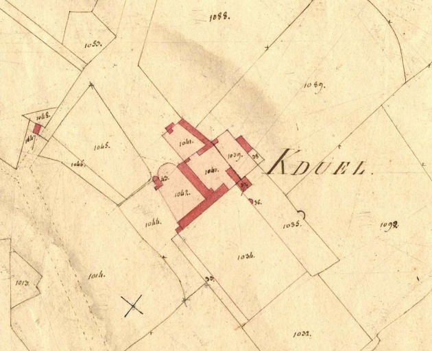 Le Kerduel est une seigneurie importante, avec droit de haute justice, comme en témoignent une fourche et quatre pots de justice, localisés au lieu-dit Le Dossen. Le château fait partie d’un domaine comprenant plusieurs métairies et une chapelle domestique, appelée chapelle Sainte-Anne. Aucune mention d’un colombier n’est faite. Cependant, le cadastre ancien de 1808 représente, sur les parcelles 1042 et 1040, qui appartiennent au château de Kerduel, quatre autres bâtiments se trouvent, dont un bâtiment en demi-lune qui accole un autre bâtiment en L renversé verticalement, que l’on peut supposer être une tour ou un colombier. Le cadastre montre également un parc paysagé (parcelle 1034), de nombreux bois, de grandes avenues décoratives et un étang qui a probablement englouti les anciennes douves. À l’extrémité droite de la façade postérieure (celle qui forme la barre horizontale du U), un long et large bâtiment est représenté à la verticale, accolé à l’aile gauche de la façade antérieure. Il pourrait s’agir des dépendances.