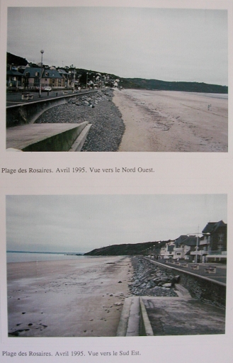 Le front de mer de la plage des Rosaires est protégé de la mer par une digue-promenade, construite en béton, longue d'environ 1000 mètres et large de 4 mètres, pour une hauteur de 3 mètres. Cette digue est de forme rectiligne avant de prendre une certaine courbe à son extrémité Ouest. Elle est bordé d'enrochements sur toute sa longeur. Le front de mer des Rosaires est bordé de façon continue par des bâtiments, à usage d'habitation, d'accueil hôtelier et d'équipements de loisirs. Un habitat plus récent est installé le long de la voie principale qui mène à la plage et sur les hauteurs de la falaise. A l'extrémité de la digue-promenade, on peut remarquer un blockhaus et un tobrouck, datés de la seconde guerre mondiale. Les anciennes cabines de bains ont laissé la place à une rangée de cabines en terrasse. On peut encore remarquer le centre municipal de voile avec sa rampe d'accès à la mer.