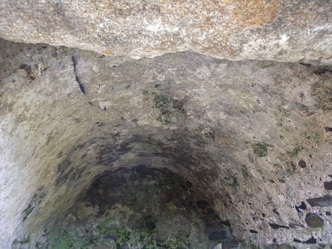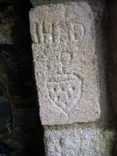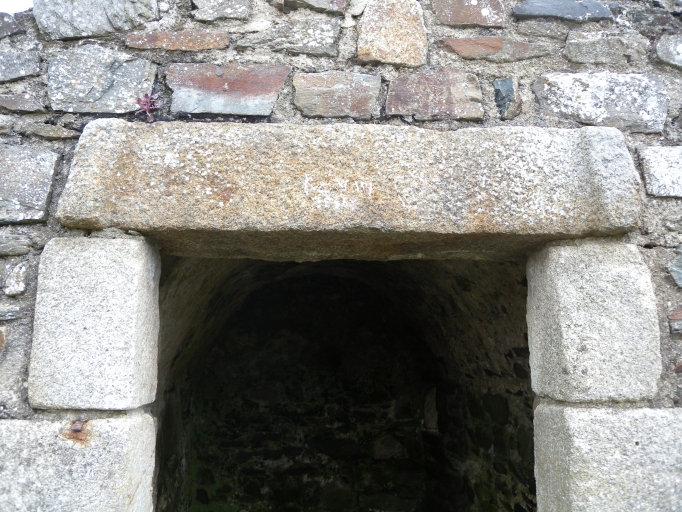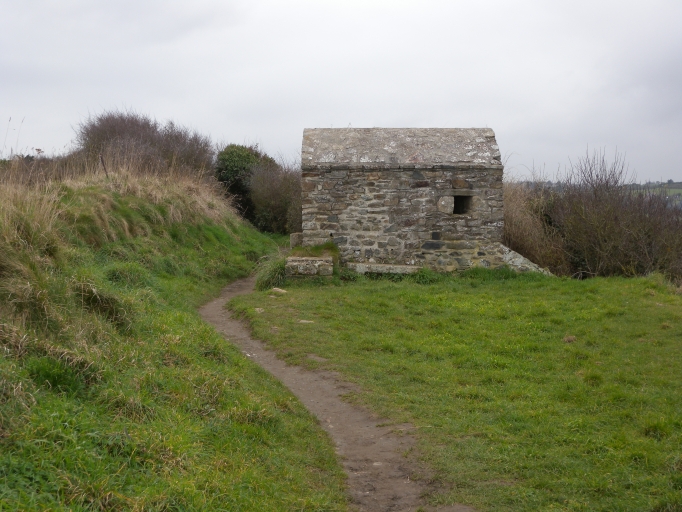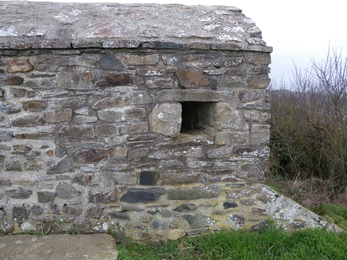 Le corps de garde a été édifié avec une maçonnerie en moellons de schiste et des pierres de taille (granite). Il mesure 3 mètres de longueur hors-tout, 2, 50 mètres à l'intérieur, 2, 67 mètres de largeur hors-tout et 1, 38 mètres à l'intérieur, pour une hauteur d'environ 1, 68 mètres à l'intérieur et 2, 50 mètres à l'extérieur. La voûte intérieure et la couverture sont en moellons de schiste, maçonné avec du sable de mer et de la chaux. L'ouverture principale, située au Sud mesure 1, 68 mètre de hauteur et 0, 81 mètre de largeur. Elle présente un encadrement en pierre de taille et à l'intérieur une pierre avec des armoiries sculptées, servant de contrefort intérieur (au Sud-Est). Le mur Nord est aveugle et le mur latéral Est présente une petite ouverture (meurtrière), de 0, 30 mètre sur 0, 30 mètre.