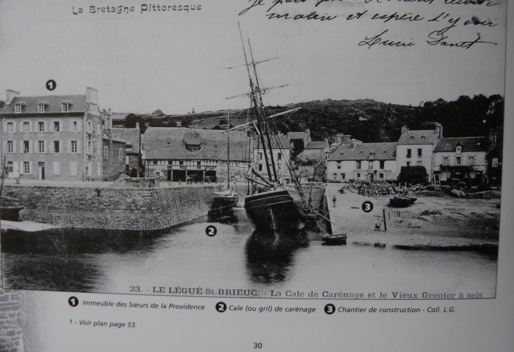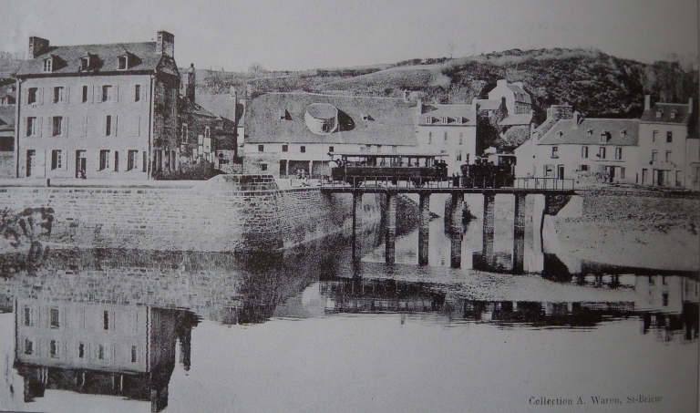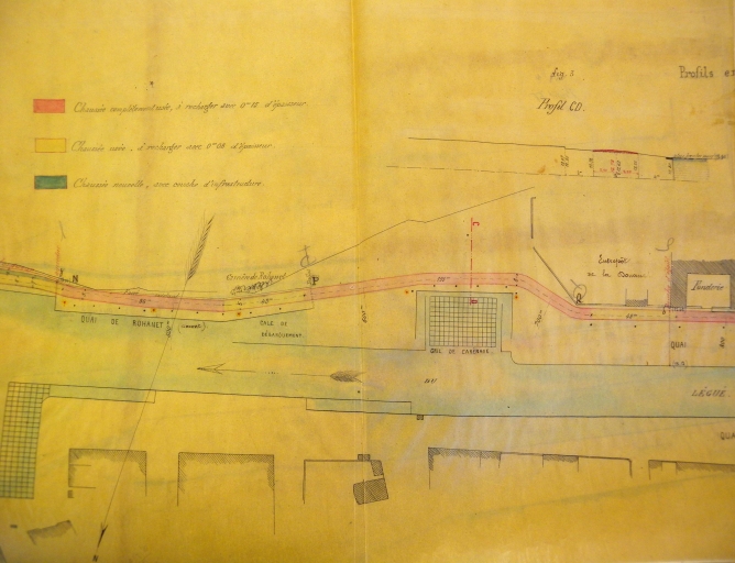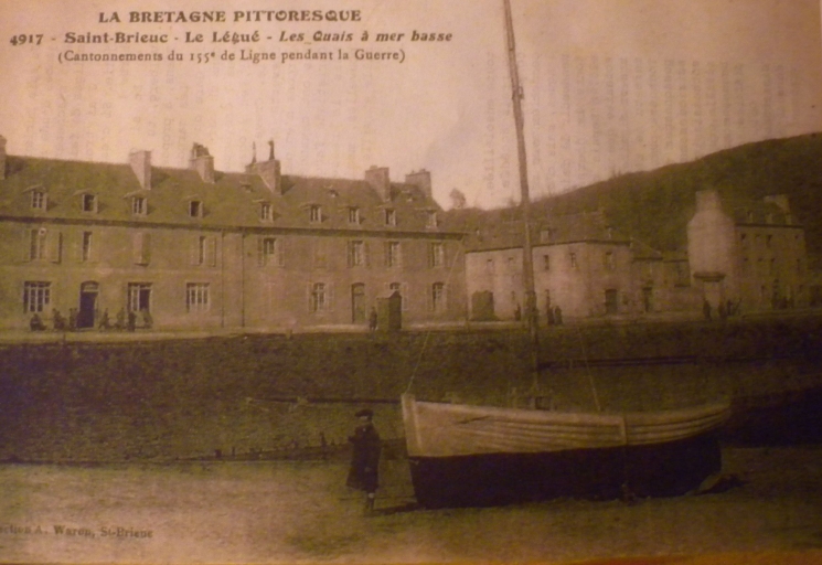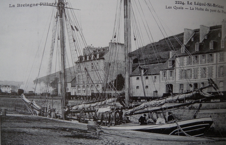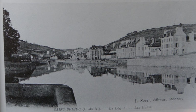 Jusqu'au 18ème siècle et avant la Révolution, le port du Légué était un port d'échouage. On s'efforça d améliorer la liaison ville-port : ce fut d'abord la rénovation du chemin des Forges à Port-Favigo, appelé Chemin-Neuf (l'actuelle 'veille côte du Légué'). Les déblais de la route permirent de réaliser une levée insubmersible sur la rive gauche du port. Le quai de l'Aiguillon et ses deux cales latérales furent construits sur les plans de Chocat de Grandmaison, ingénieur en chef à Rennes et Mangin, ingénieur du Roi, entre 1758 et 1767. Emmanuel Armand de Vignerot du Plessix de Richelieu, duc d'Aiguillon (1720-1788), commandant en chef des troupes royales sous Louis XV, fut à l'origine de la construction de ses quais, dont le quai rive gauche qui portait son nom. Les déblais furent employés pour former une levée insubmersible sur la rive gauche à partir du pont. Le vieil et vétuste embarcadère des Favigo resta en retrait du nouveau port. Le quai longeait la partie droite qui s'étendait de l'ancienne chapelle Saint-Julien au bâtiment des 'galeries', sur une longueur de 160 mètres. Deux cales le prolongeaient à son extrémité. La première pierre fut posée en 1758 par le duc d'Aiguillon, gouverneur de Bretagne et Mgr Thépault du Breignou, évêque de Saint-Brieuc. Le quai fut achevé en 1767. Furent ensuite construits la cale du grenier à sel, avec son chantier de construction. A l'emplacement de cette cale, aujourd'hui comblée, se tient la place de la Résistance. Mais en 1773, une terrible inondation détériora ce nouveau quai et emporta le pont de bois. Quelques années plus tard, la communication fut rétablie par le fond du port (nouveau chemin passant par le village du Gouët) et par une passerelle submersible face à la maison Favigo. Les régimes qui ont succédé à la Révolution française ont poursuivi avec parcimonie l'aménagement du port : entre 1804 et 1806, le prolongement du quai avec cale est réalisé sur une longueur de 117 mètres. Les travaux comprenaient un palier de 20 mètres situé au niveau de la cale existante, une nouvelle cale de 53 mètres dirigée en sens inverse de la précédente et un mur de quai de 42 mètres. Cependant, le Légué restait un port vétuste. Il fallut attendre la période de la Restauration pour qu'un véritable projet de port 'moderne' aboutisse. Dès 1815, fut dressé un projet de reconstruction d'un pont roulant, permettant la remontée des navires jusqu'au pont du Gouët par un canal à entreprendre également. Un gril de carénage et des cales de construction navale y auraient trouvé place en amont de l'ouvrage. Le projet initial fut néanmoins modifié en cours de travaux et l'ouvrage définitif, terminé en 1821, ne ressemblait plus en rien à celui projeté. Il ne donnait plus la possibilité de remonter le Gouët, avec un tablier en bois, fixe, prévu pour une voie unique. L'ouvrage sera reconstruit en 1861 pour un élargissement du tablier à deux voies et 7 mètres de chaussée. Le quai en aval du pont, jusque la cale Ouest du quai d'Aiguillon, a été édifié sur les plans de l'ingénieur Lecor entre 1821 et 1829. La portion de quai, en aval de l'ancienne cale, a été réalisée entre 1837 et 1840 sur les plans de l'ingénieur Lalande et prolongée en 1844 par l'ingénieur Fessard. Ces deux réalisations constituent aujourd'hui le quai de Nemours. Le quai de Rohannet est fut baptisé en 1847. Dès 1855, l'éclairage des quais du Légué fut envisagé et réalisé. Des réverbères furent d'abord installés en amont puis sur le chemin de halage en 1871 et enfin sous la Tour en 1906. Le quai d'Aiguillon et le quai de Nemours s'appellent aujourd'hui le quai Jacques Guinard et le quai Gabriel Péri. En 1912, le mur de quai rive gauche, qui devait fermer l'ancienne cale de carénage, fut élevé à moitié de sa hauteur. En mars 1913, la passerelle en bois disparaîssait lors du comblement de la cale. En août 1913, le mur de quai amont était achevé, et le terre-plein en arrière de ce mur, remblayé et empierré. La cale de carénage était comblée définitivement.