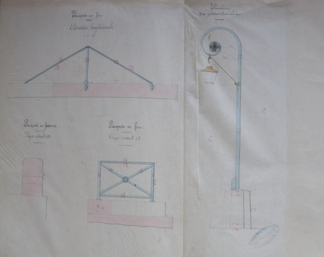 AD Côtes-d'Armor. 3 O 187. Plan du port du Légué en amont, 1855. Plan des parapets et d'un réverbère, 1855.