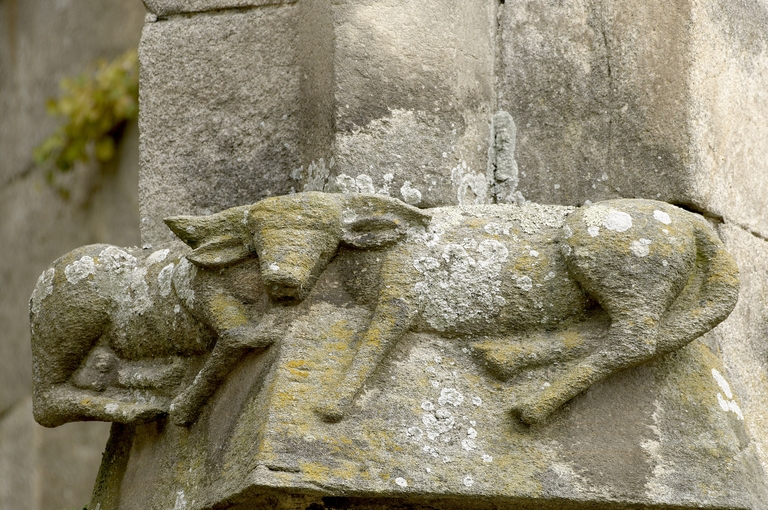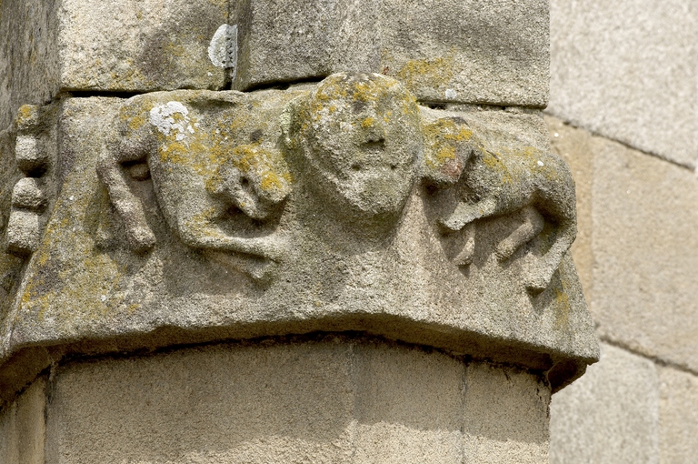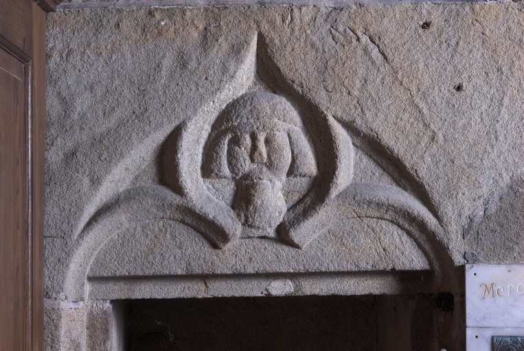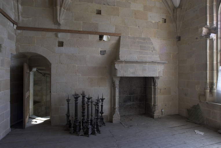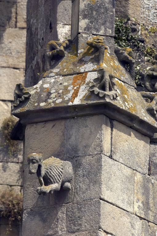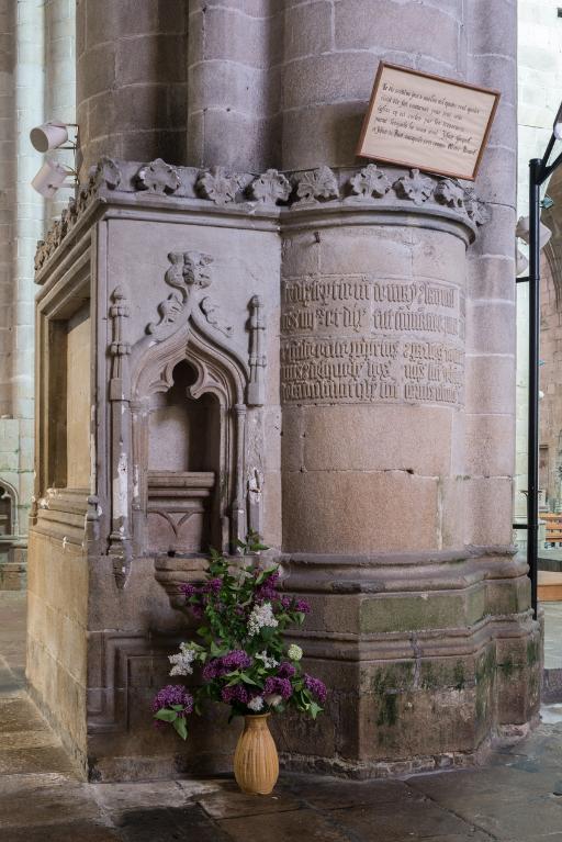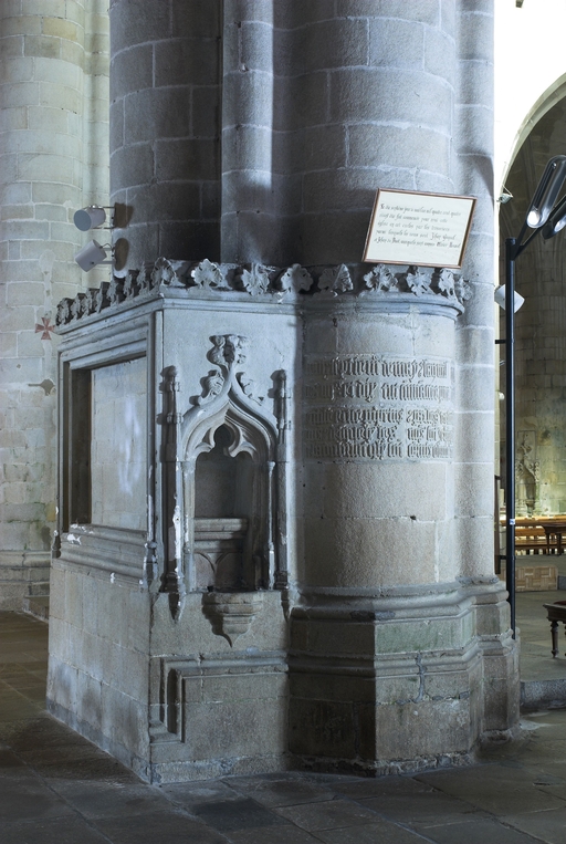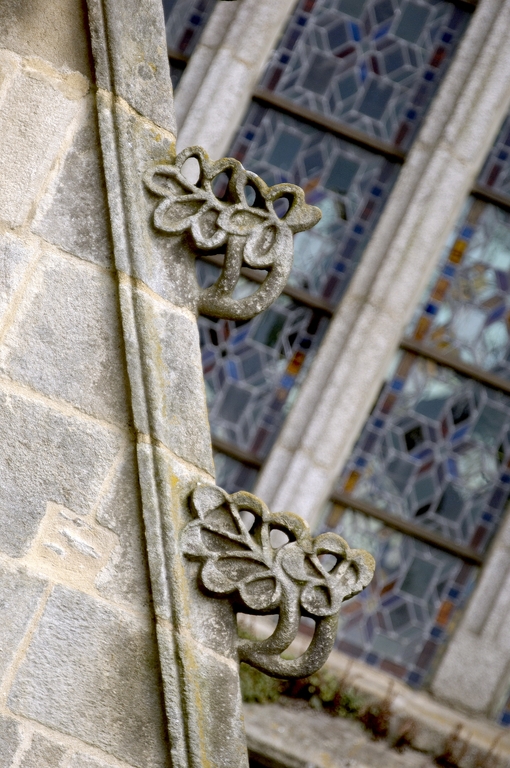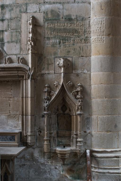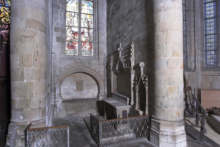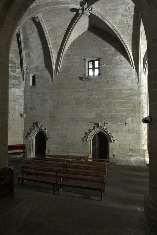Au-delà de la première chapelle sud, une portion de mur aveugle correspond à la sacristie dont l'entrée est marquée par une porte en arc brisé à accolade et fleuron. Au-dessus, une fenêtre à croisée donnant sur le chœur intrigue : cette baie intérieure correspond à une pièce située à l'étage, desservie par un escalier séparé dont l'accès se trouve situé immédiatement après la porte de la sacristie. Cette pièce pourvue d'un accès indépendant, d'une élégante cheminée et éclairée au sud par une grande vitre à réseau flamboyant (restaurée au XIXe siècle), devait être couverte par une fausse voûte lambrissée en bois reposant sur des tas de charges en pierre. Le soin de mise en œuvre de cette pièce, son confort ainsi que sa fenêtre regardant vers le maître-autel incitent fortement à y voir un oratoire seigneurial conçu pour Jean II de Rohan, fondateur et « patron » de l’église, qui put servir ensuite pour les réunions du conseil de fabrique. La plupart des chapelles du chœur ont conservé un riche mobilier d'attache en granite sculpté : des retables à fortes moulures assortis de leurs niches crédences, parfois aussi accompagnés d'enfeus en arcade, comme dans la 4e chapelle nord, attestent leur affectation privilégiée à différentes familles de la noblesse.