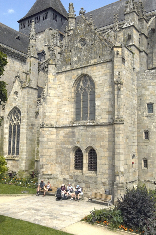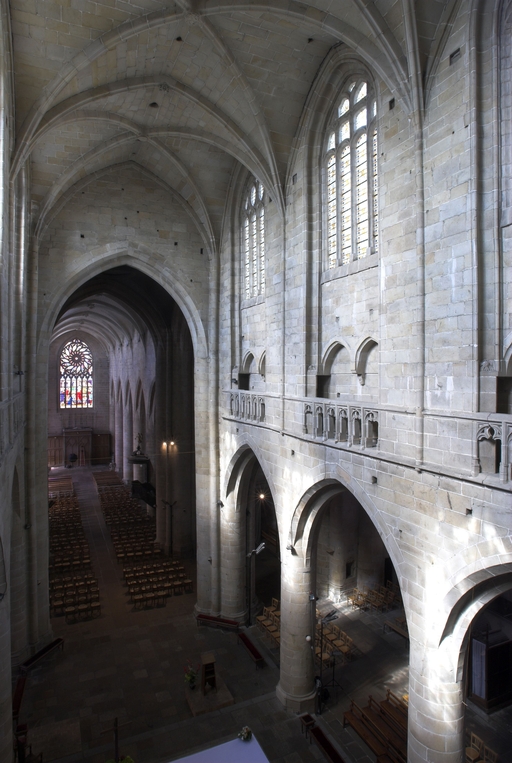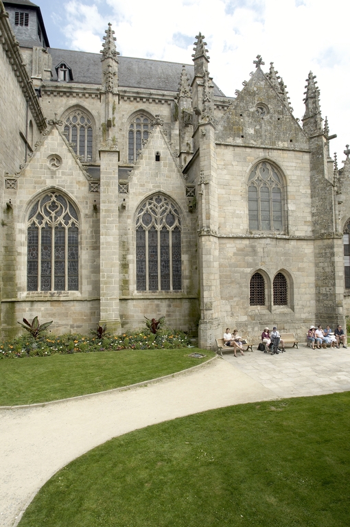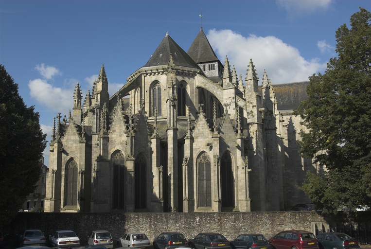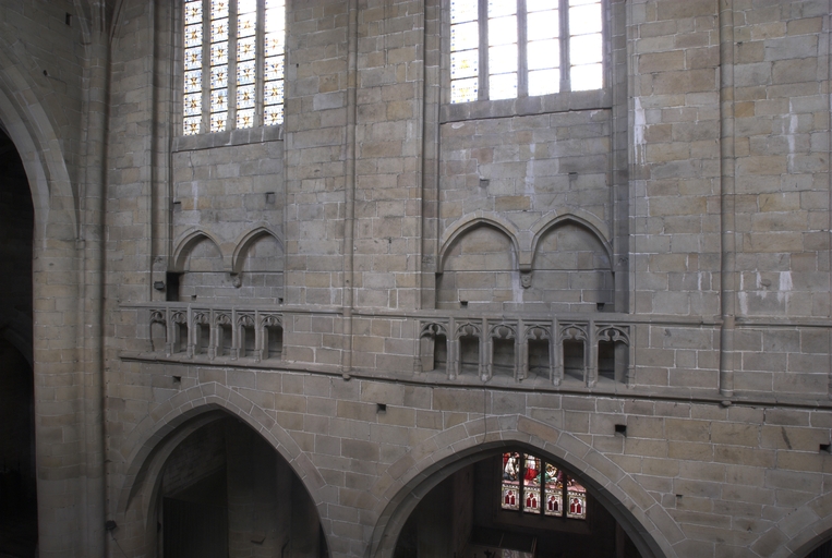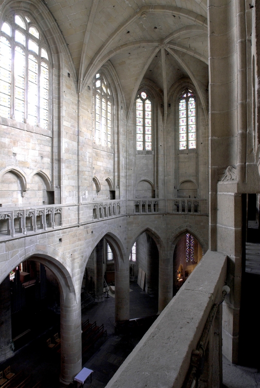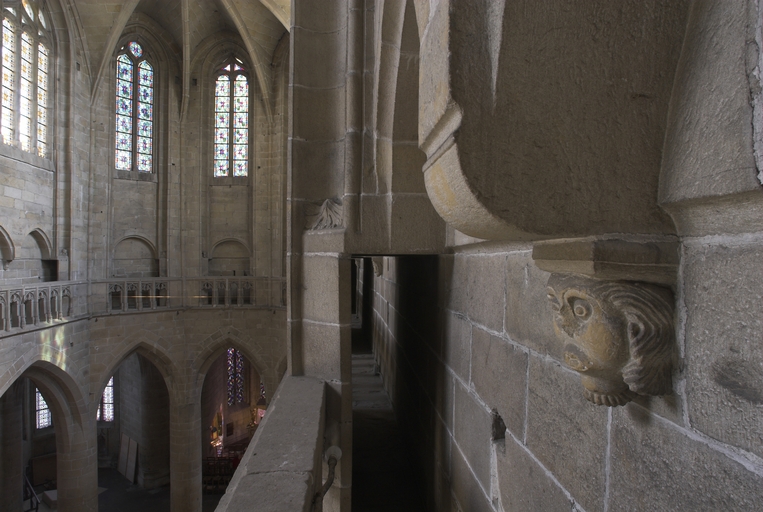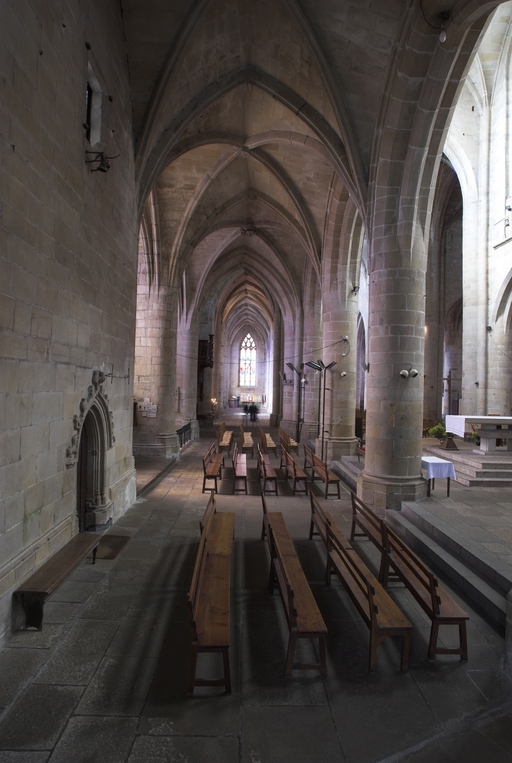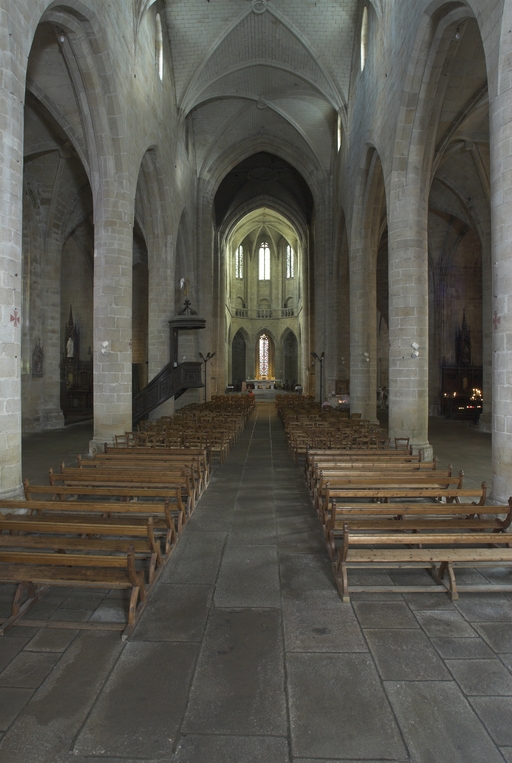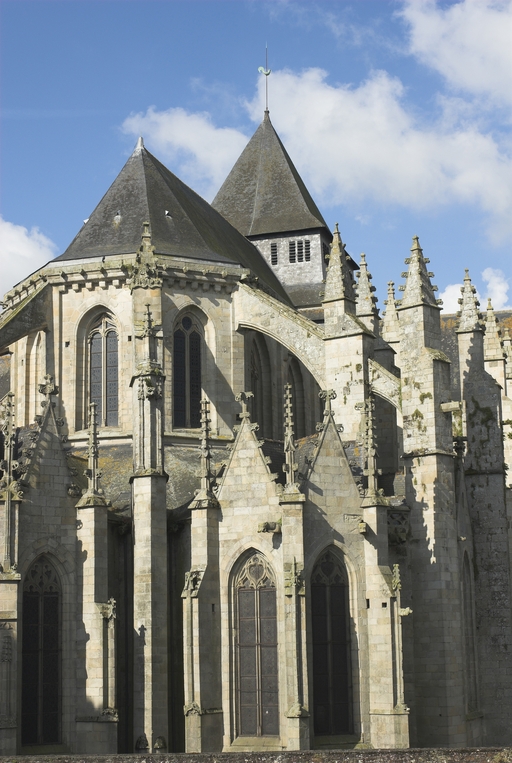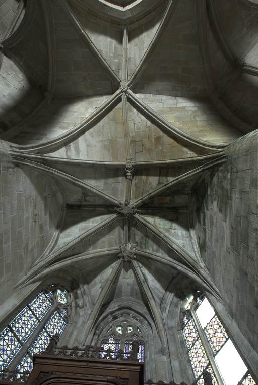 L’emploi des voûtes n'est pas moins remarquable. Les voûtes à croisées d'ogives des collatéraux et du déambulatoire, dont les nervures viennent rentrer directement dans les piles cylindriques du sanctuaire, sont comme prolongées latéralement dans les chapelles latérales des travées droites par des voûtes transversales en berceau brisé, nervurées à l'imitation des croisées d'ogives. Cette solution inédite est sans doute ici liée à une recherche de stabilité : les berceaux transversaux jouant plus que des voûtes d'ogives un rôle de contrebutement. La mention dans les comptes de fabrique d'une couverture provisoire en chaume installée sur le chœur de l'église dès la fin de l'année 1490, signifie sans doute qu'à cette date seul le premier niveau du chœur (les grandes arcades et la couronne de chapelle) est édifié. L'envoi en 1505 du maître d'œuvre Guillaume Juhel à Coutances pour prendre modèle sur l'église paroissiale Saint-Pierre alors en cours de construction, pourrait expliquer le choix qui fut adopté pour les parties hautes de l'édifice. Ainsi, au lieu de l'habituelle élévation à trois niveaux, grandes arcades, triforium et fenêtres hautes, employée jusqu'au XVe siècle en Bretagne dans la plupart des grandes églises, le choix d'une élévation à deux niveaux avec passage en contrebas des fenêtres hautes s'est imposé ici. Toutefois, si l'emprunt du principe au modèle normand est peu contestable, le traitement de l'élévation demeure fidèle à la tradition bretonne. Au lieu du garde-corps continu qui interrompt à la manière d'un bandeau la scansion des travées des nefs normandes, le constructeur breton adopte un rythme segmenté qui réserve l'ajourage du garde-corps à la largeur des fenêtres hautes et privilégie ainsi une lecture verticale. Le dessin du garde-corps lui-même, une suite d'arcatures à trilobes et écoinçons évidés, à l'opposé des tracés compliqués du flamboyant, reprend un modèle vieux de plus d'un siècle, largement employé au XVe siècle dans les triforiums bretons. Enfin, pour éviter l'emploi d'un mur épais, l’architecte reprend une solution introduite dès le XIIIe siècle dans la nef de Dol, celle du recours à des séries d'arcs qui retombent sur des corbeaux de pierre.