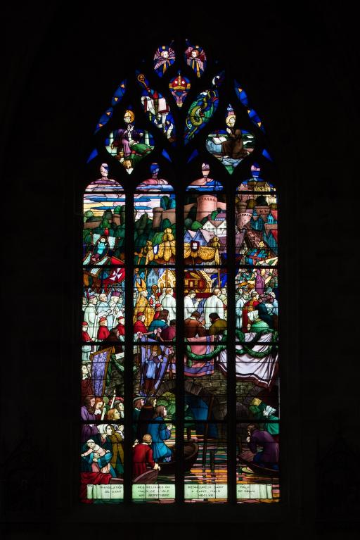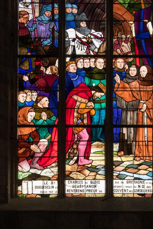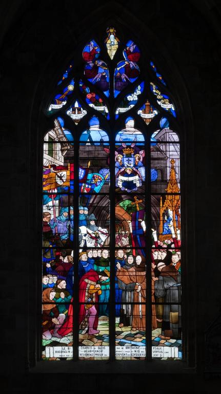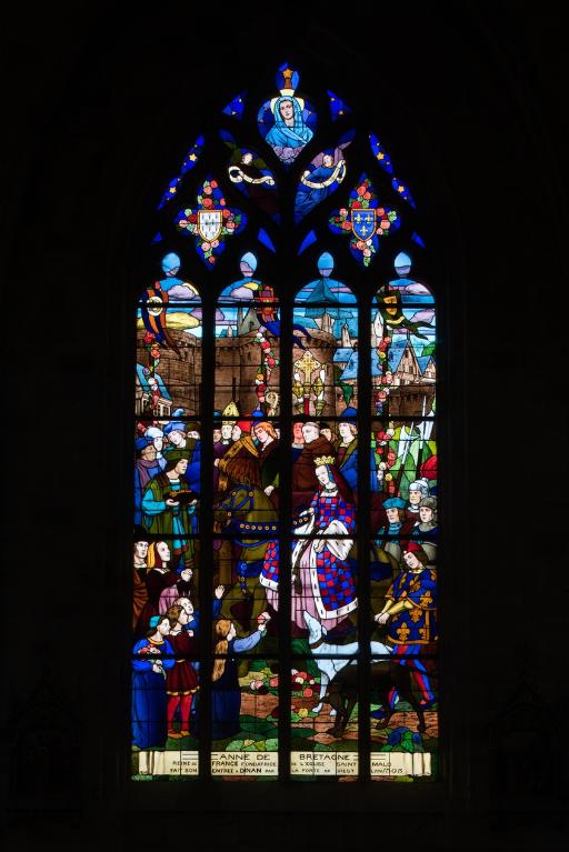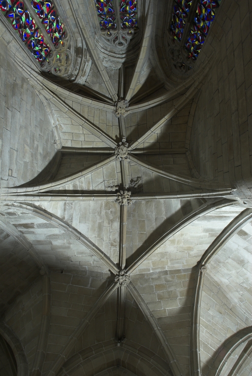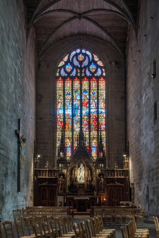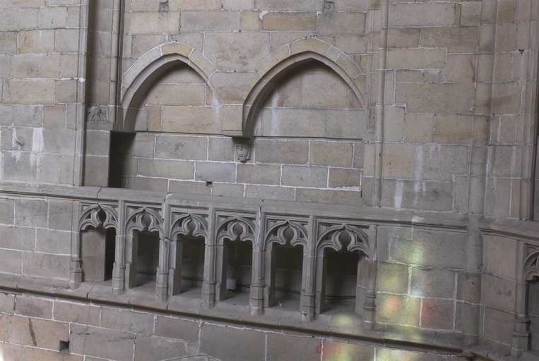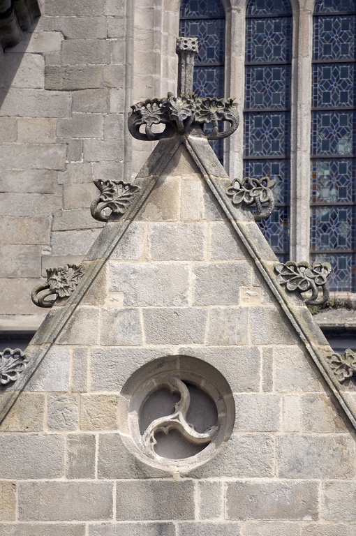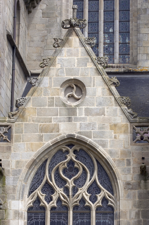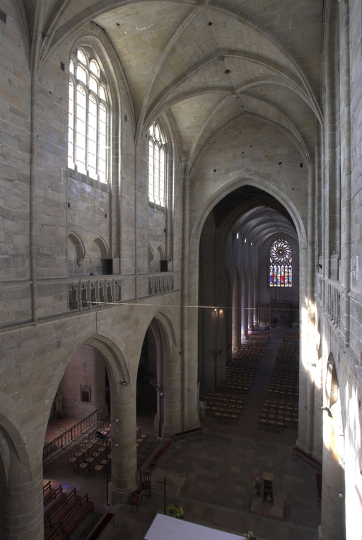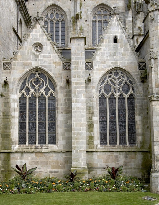 L’emploi des voûtes n'est pas moins remarquable. Les voûtes à croisées d'ogives des collatéraux et du déambulatoire, dont les nervures viennent rentrer directement dans les piles cylindriques du sanctuaire, sont comme prolongées latéralement dans les chapelles latérales des travées droites par des voûtes transversales en berceau brisé, nervurées à l'imitation des croisées d'ogives. Cette solution inédite est sans doute ici liée à une recherche de stabilité : les berceaux transversaux jouant plus que des voûtes d'ogives un rôle de contrebutement. La mention dans les comptes de fabrique d'une couverture provisoire en chaume installée sur le chœur de l'église dès la fin de l'année 1490, signifie sans doute qu'à cette date seul le premier niveau du chœur (les grandes arcades et la couronne de chapelle) est édifié. L'envoi en 1505 du maître d'œuvre Guillaume Juhel à Coutances pour prendre modèle sur l'église paroissiale Saint-Pierre alors en cours de construction, pourrait expliquer le choix qui fut adopté pour les parties hautes de l'édifice. Ainsi, au lieu de l'habituelle élévation à trois niveaux, grandes arcades, triforium et fenêtres hautes, employée jusqu'au XVe siècle en Bretagne dans la plupart des grandes églises, le choix d'une élévation à deux niveaux avec passage en contrebas des fenêtres hautes s'est imposé ici. Toutefois, si l'emprunt du principe au modèle normand est peu contestable, le traitement de l'élévation demeure fidèle à la tradition bretonne. Au lieu du garde-corps continu qui interrompt à la manière d'un bandeau la scansion des travées des nefs normandes, le constructeur breton adopte un rythme segmenté qui réserve l'ajourage du garde-corps à la largeur des fenêtres hautes et privilégie ainsi une lecture verticale. Le dessin du garde-corps lui-même, une suite d'arcatures à trilobes et écoinçons évidés, à l'opposé des tracés compliqués du flamboyant, reprend un modèle vieux de plus d'un siècle, largement employé au XVe siècle dans les triforiums bretons. Enfin, pour éviter l'emploi d'un mur épais, l’architecte reprend une solution introduite dès le XIIIe siècle dans la nef de Dol, celle du recours à des séries d'arcs qui retombent sur des corbeaux de pierre.
