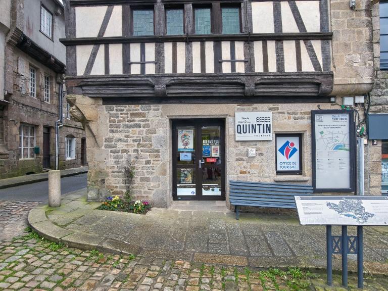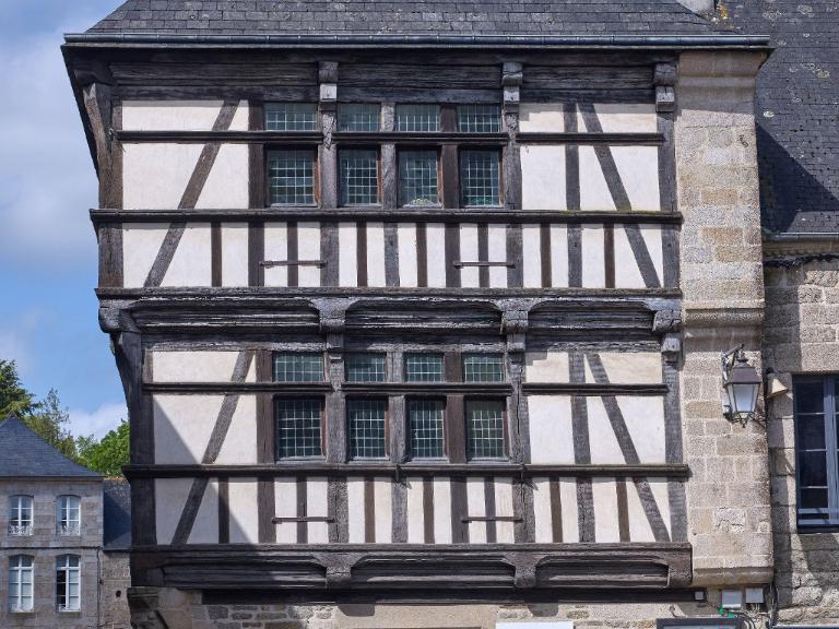 Maison d'angle dont le pignon donne sur la place centrale où se trouvaient anciennement les halles à la viande. Les deux façades sur rue sont construites en pan de bois en encorbellement avec entretoises, ancré dans les ressauts des murs. Un très gros visage qui semble tirer la langue orne l'angle du rez-de-chaussée, sous la poutre d'enrayure. Cette figure grotesque aurait été dénommée Mardi gras, Papa au Lait ou plus récemment Bonhomme de Quintin par les habitants.