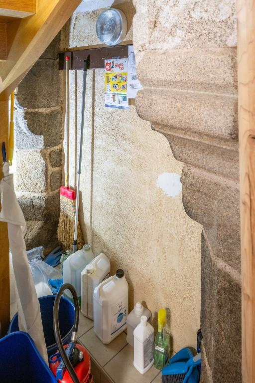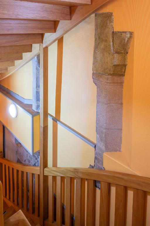 L'escalier en vis d'origine séparait l'ensemble en deux parties de surface inégale. A marches en pierres puis en bois, on y accédait dans les années 1960 depuis la rue au Lait. La partie "arrière" conserve des fragments de cheminées dans le pignon ouest, au rez-de-chaussée comme au premier étage. Deux cheminées dans le pignon nord assurent le confort de la partie "avant". Celle du deuxième étage est légèrement décalée et côtoie la hotte de celle du premier. Un four est construit ultérieurement dans la cave, côté place.