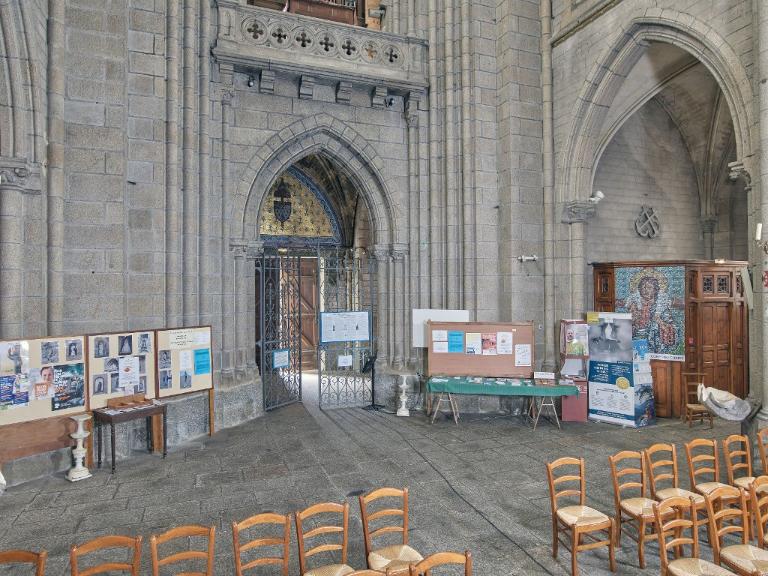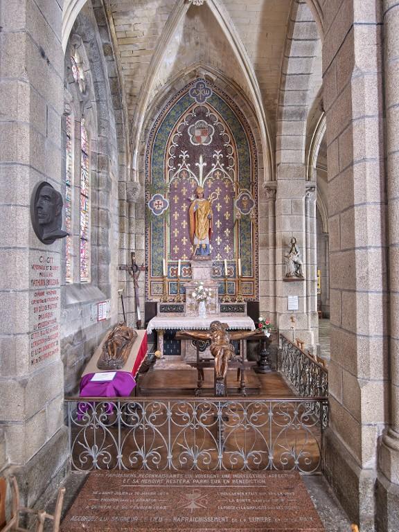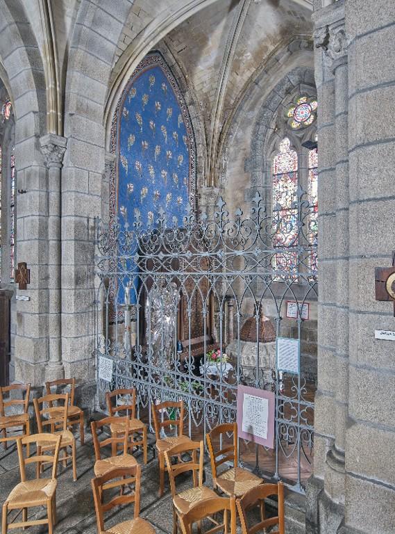 Quatre chapelles s'ouvrent sur le transept. Celle qui est située au nord-ouest fait office de chapelle des fonts. Séparée par une clôture haute, elle accueille l’armoire renfermant le reliquaire monumental de 1871, la statue de la Vierge en argent du jubilé de 1875 et le baptistère dessiné par Jeanne Malivel.