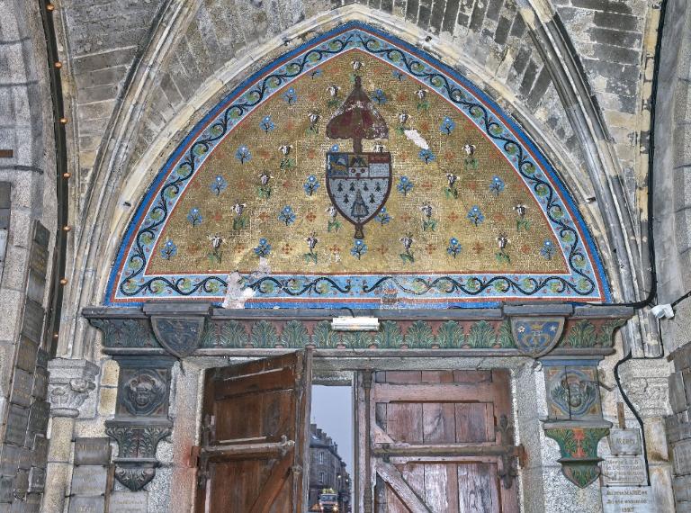 Le revers du tympan du portail d'entrée dans le porche est orné d'un décor de mosaïque à semis de fleurs de lys et de fleurs bleues. Il est délimité sur son pourtour par un bandeau de rinceaux végétaux. Au centre, sont peints un écu aux armes de la collégiale, du pape Pie XI (1857-1939) et de la ville de Quintin, ainsi que la représentation de la statue couronnée de Notre-Dame de Délivrance. Il s'agit d'un ajout effectué lors de l'érection de l'église en basilique (1934), symbolisée par l'ombellino. Sous le tympan, le linteau de la porte est orné d'une frise de feuilles d'acanthe. Le monogramme "AM" (Ave Maria) est sculpté en bas-relief sur les deux culots qui recevaient autrefois les statues d'anges en prière devant l'effigie de Notre-Dame de Délivrance lorsqu'elle était présentée au revers du tympan.