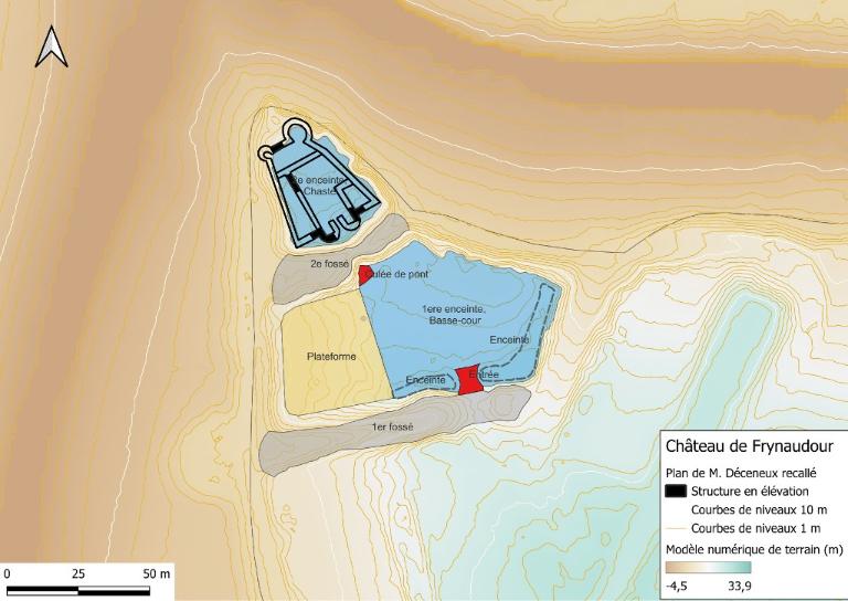 Le modèle numérique de terrain couvrant le château, en lien avec la visite de terrain, permet de distinguer un château structuré autour de deux enceintes culminant de 6 à 8 m au-dessus des fossés. Elles forment deux ensembles isolés par deux fossés successifs.