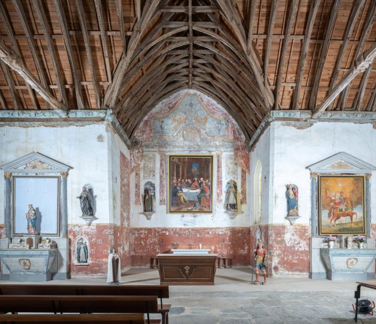 Les nouveaux aménagements du 18e siècle remodèlent l’espace et le décor de l’église. En 1728, une clôture remplace le jubé afin de réunir dans un même espace sacré le choeur, la chapelle nord, dite de Saint-Anne, et la chapelle sud dite du Rosaire. A cette occasion, le général procède à l'installation de stalles dans le choeur. La chaire à prêcher du 17e siècle est remplacée en 1775 par un nouveau modèle commandité par les marchands de toiles Jean-François Le Goff et Jean Le Meur. En 1791, l’installation du mobilier de l’abbaye de Bon-Repos - ensemble de boiseries, maître-autel en marbre à suspension eucharistique, tabernacle, aigle lutrin, ensemble de trois confessionnaux - nécessite la reconstruction du chœur. Ces travaux d’embellissement engendrent la destruction du retable et du maître-autel du 17e siècle. De même, la campagne de décoration dont l’église fait l’objet, dans la 2e moitié du 19e siècle, explique la disparition des retables des chapelles nord et sud, remplacés par des modèles néo-gothiques.
