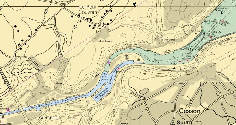 Depuis 1774, le canal depuis le quai du Légué vers l’embouchure est praticable. La prolongation du chemin de halage est demandée par la communauté de ville de Saint-Brieuc afin de faciliter le service à la navigation. En 1784, la section ouest du canal (entre le pont et la quai), est en partie ouverte. Elle est tributaire de l’édification de la levée de terre permettant une communication entre le pont et le nouveau quai ; celui-ci ayant entrainé un changement des voies d’accès aux berges. Les travaux d’assèchement des marais permettent de créer des terrains vagues qui seront à lotir à des fins d’habitations et de fonctions portuaires. C’est ainsi que le maire de Saint-Brieuc, Poulain-Corbion, met en avant les qualités du projet de l’ingénieur Perroud : « L’ouverture de ce canal procurera en rapprochant le port de la ville et en diminuant les frais de transports des marchandises d’un tiers au moins mais encore en procurant plus de facilité pour l’embarquement des toiles en laissant un vaste terrain pour lequel on bâtira des magasins. Et, le moindre avantage est la beauté du port qui deviendra un des plus joli et des plus commode de la province » (11 mars 1783). De nombreux documents d’archives traitent des échanges administratifs au 18e siècle entre la ville de Saint-Brieuc et le royaume pour la mise en concession des terres prises sur le domaine maritime royal. A la fin du 18e siècle, la rive droite bénéficie aussi d'ouvrages portuaires (1780-1790) : quai, cales de construction, gril de carénage, chemin de halage et terre-plein.